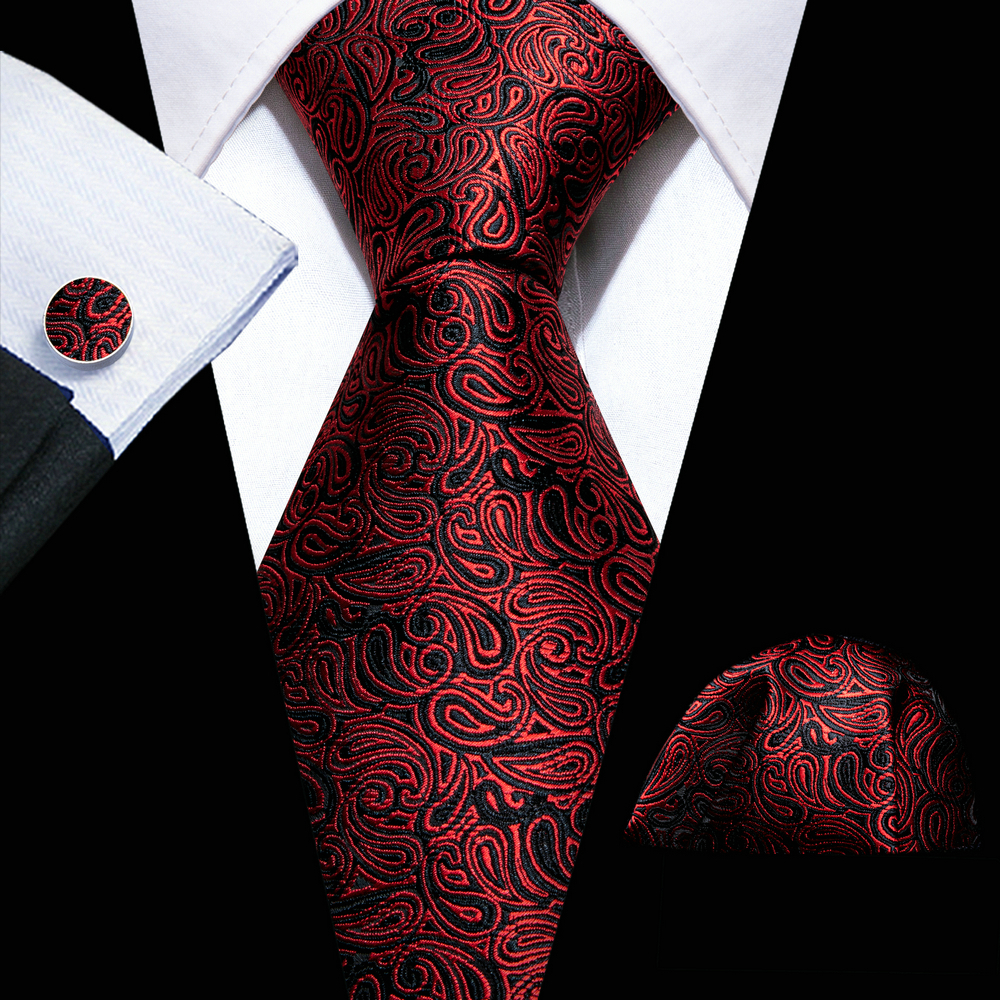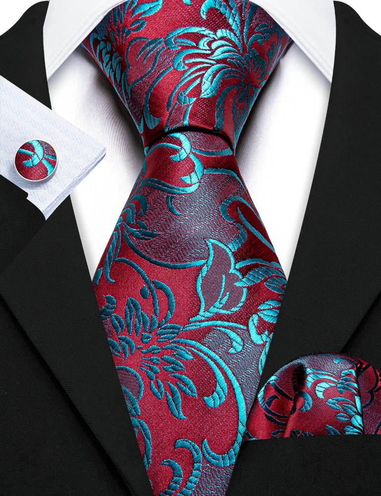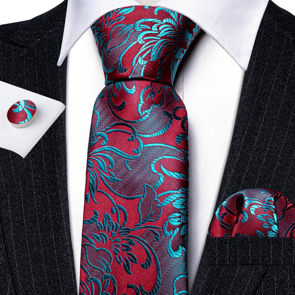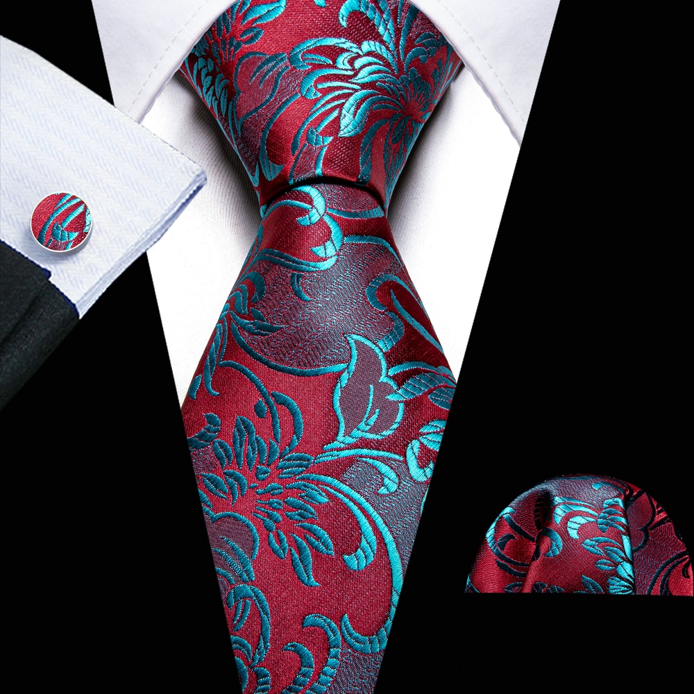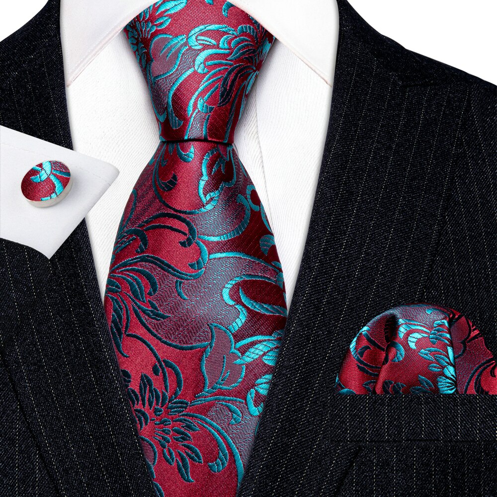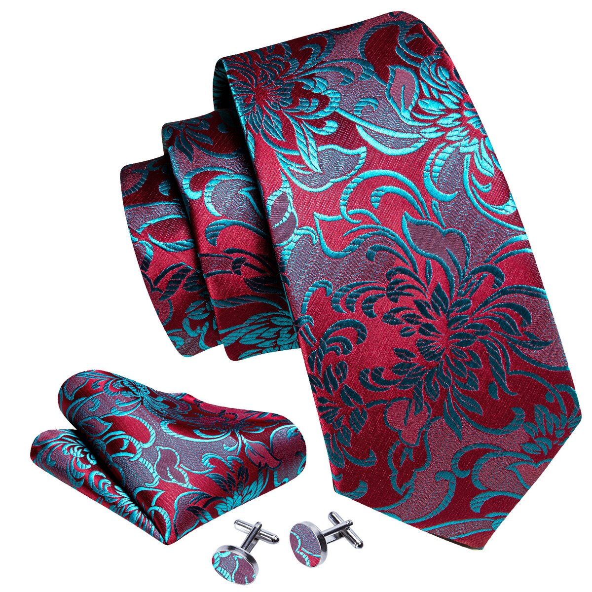 Fashion Silk Red Blue Teal Floral Men Tie Set Necktie Handkerchief Cufflinks Wedding Gift Barry. Wang Tie Pin Brooches A-6074