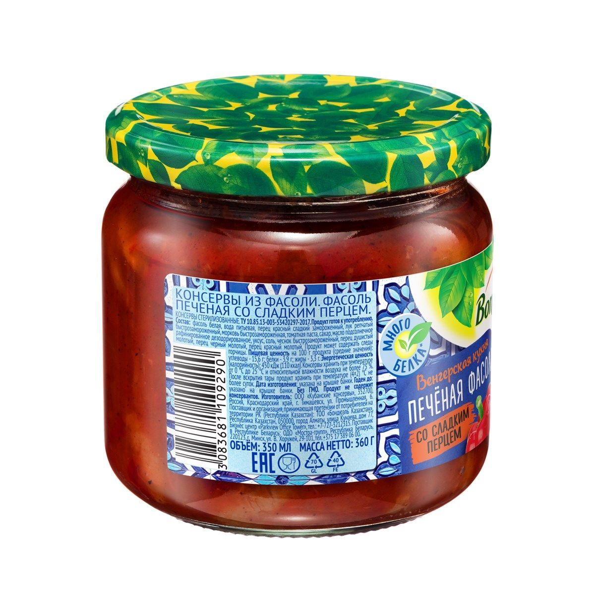 Описание: Печеная фасоль BONDUELLE с перцем станет отличной закуской на любом столе. Продукт полностью готов к употреблению. В его состав входят белая фасоль, питьевая вода, красный сладкий замороженный перец, репчатый быстрозамороженный лук, морковь, томатная паста, сахар, подсолнечное рафинированное дезодорированное масло, уксус, соль, чеснок, душистый молотый перец, черный и красный молотый перец.Овощная смесь продается в стеклянной банке, плотно закрытой крышкой. Для сохранения качества ее рекомендуется хранить при температуре от 0 C до +25 C и относительной влажности воздуха не более 75%. После вскрытия упаковки содержимое необходимо употребить в течение суток.