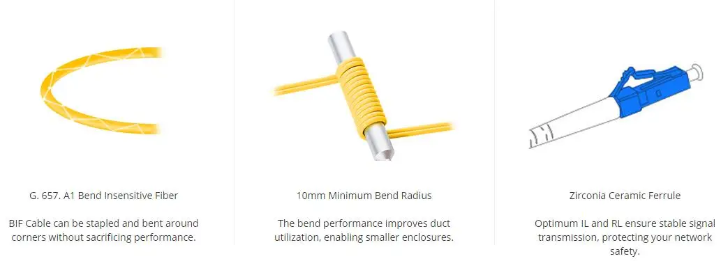 Гибкий нечувствительный волоконно-оптический кабель имеет промышленную стандартную оценку воспламеняемости ПВХ Куртка и симплексный волоконный соединитель, который отвечает EIA/TIA 604-2 для высокоскоростных кабельных сетей.