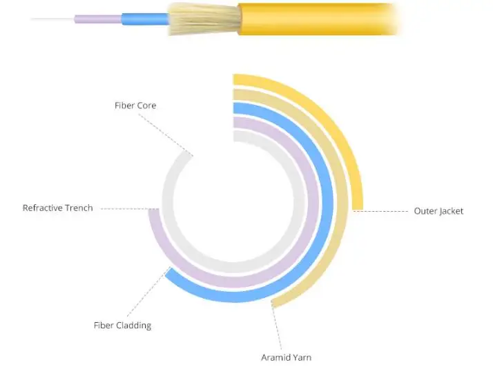 Уникальный огнеупорный Тренч с низким коэффициентом преломления стеклянный слой в BIF, который уменьшает дисперсию на светильник при скручивании и сгибании, обеспечивая стабильную и быструю передачу сети