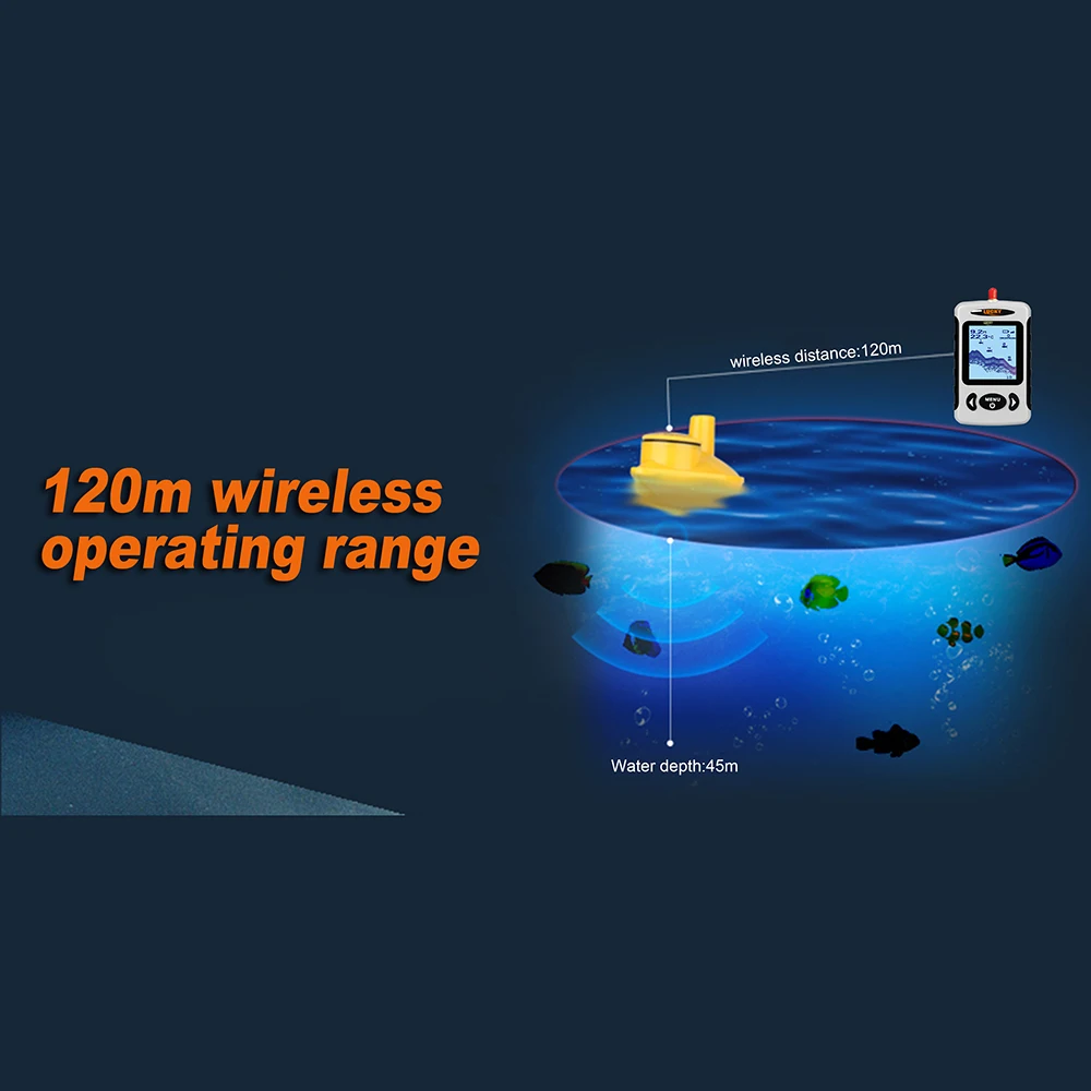 Беспроводной датчик сонара с лампой для ловли рыбы, беспроводной Рабочий диапазон 60 м (200 футов) и глубина 45 м (145 футов).