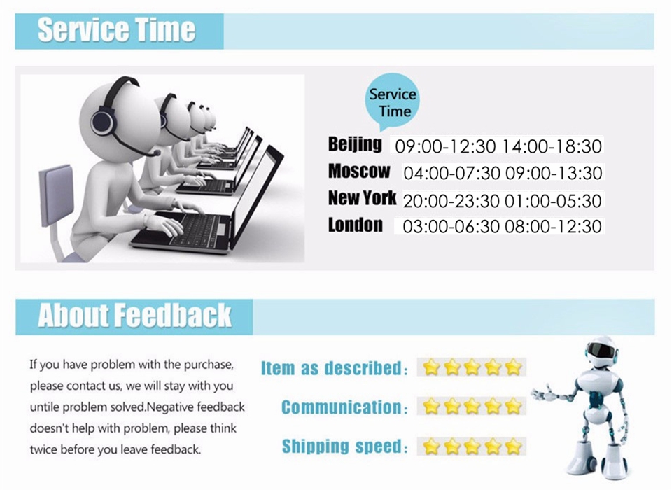 1.Если у вас возникли проблемы, пожалуйста, свяжитесь с нами. Как правило, мы можем ответить вам в течение 24 часов из-за разницы во времени. Но если у нас выходные или праздничные дни, у нас может быть задержка, чтобы ответить вам. Пожалуйста не"Не беспокойтесь об этом.