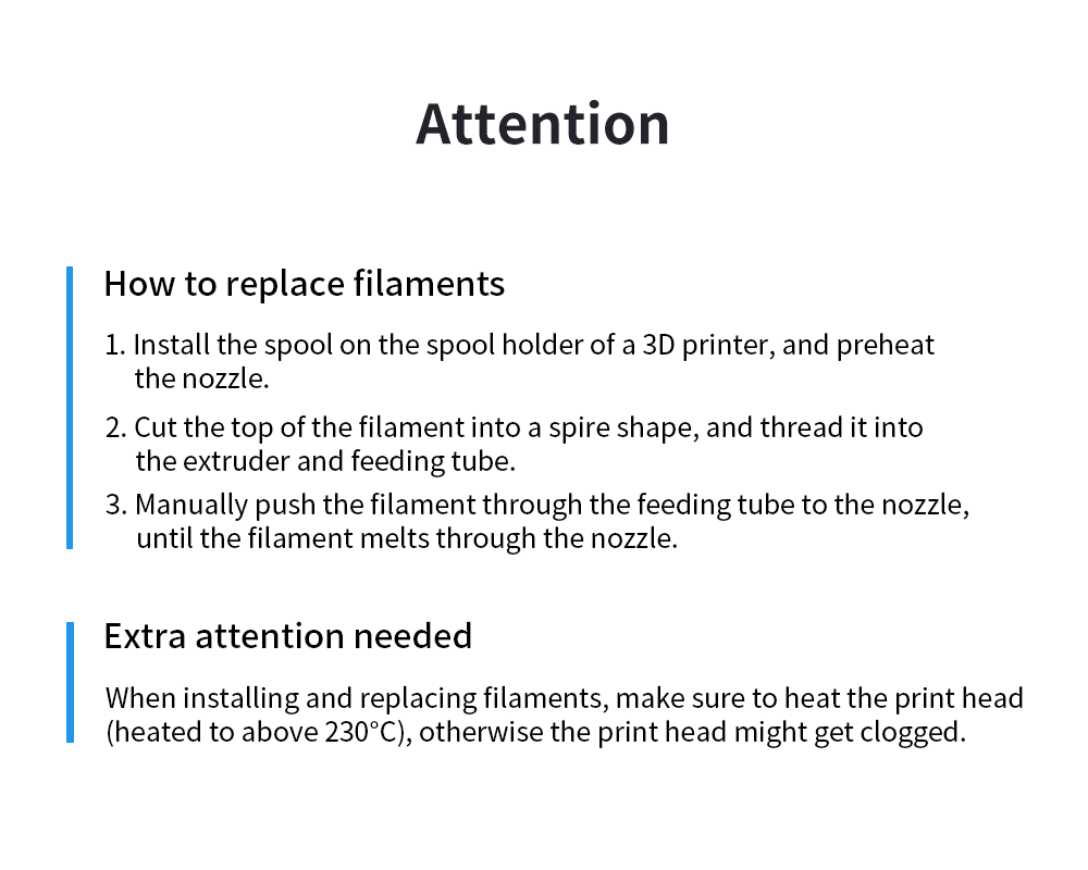Attention: When installing and replacing filaments, make sure to heat the print head (heated to above 230°C), otherwise the print head might get clogged.