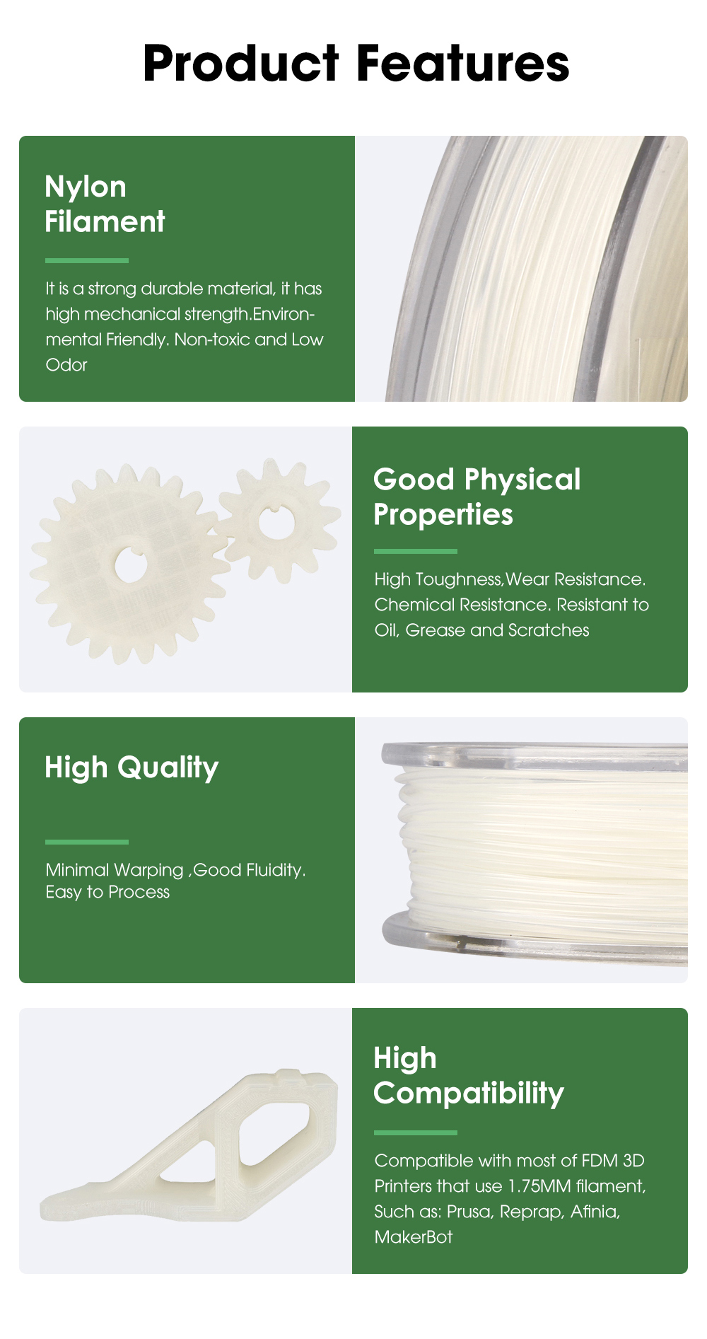 【Высокая совместимость】 совместим с большинством 3D-принтеров FDM, использующих нить 1,75 мм, таких как: Prusa, Reprap, Afinia, MakerBot, PrintrBot, UltiMaker, Airwolf, Aleph Objects, Makergear, Up, Lulzbot, silify3d, Flashforge и т. д.