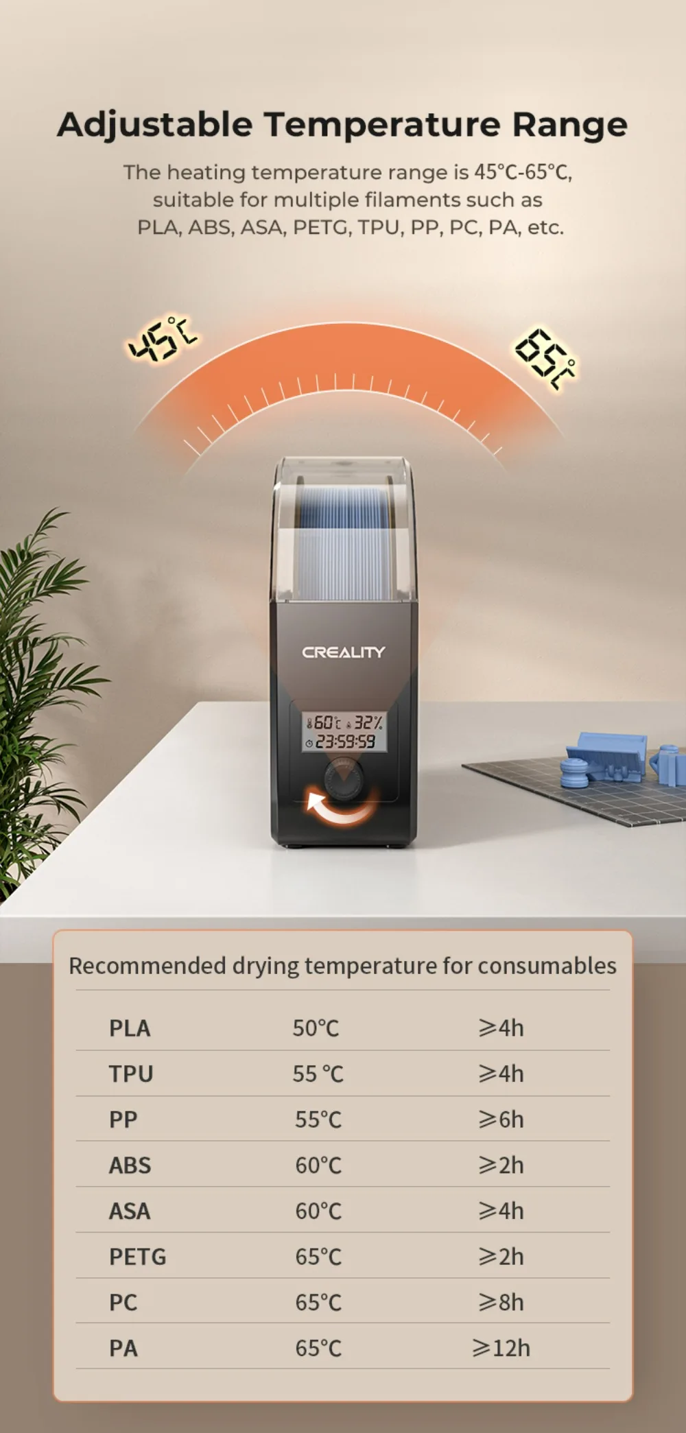 1. Регулируемая температура 45 ℃-65 ℃: подходит для PLA, ABS, ASA, PETG, TPU, PP, PC, PA и других.