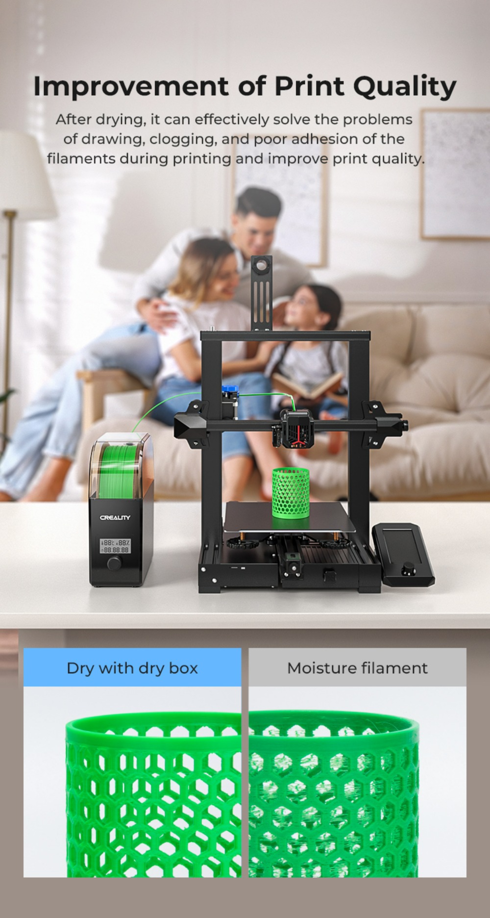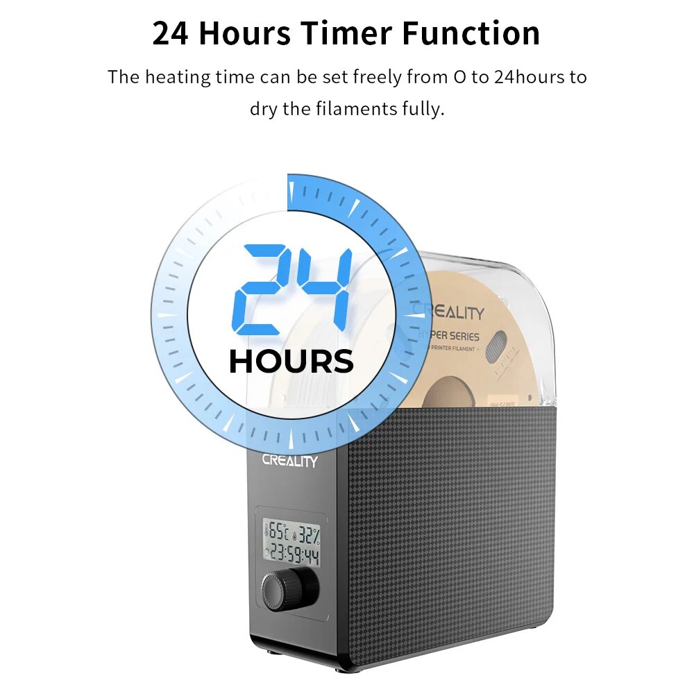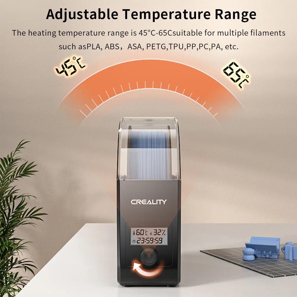 Диапазон температур нагрева составляет 45 ° ℃-65 ° ℃, подходит для нескольких нитей, таких как PLA, ABS, ASA, PETG, TPU, PP, PC, PA и т. Д.