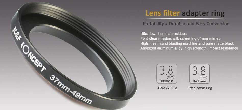 • Включите комплект переходного кольца повышающего фильтра (37-49, 49-52, 52-55, 55-58, 58-62, 62-67,67-72, 72-77, 77-82 мм) • Включите комплект переходного кольца понижающего фильтра (49-37, 52-49, 58-55, 55-52, 62-58, 67-62,72-67, 77-72, 82-77 мм) • Отличная герметичность, отсутствие шатания или перекручивания. Ультранизкие химические остатки, прикрепленные к твердому веществу! • Преобразует размер резьбы вашего объектива в размер резьбы любого другого аксессуара (такого как фильтры, бленды, вспышки и конвертеры линз). • Обработка поверхности: пескоструйная машина с высоким размером ячеек и чистый цвет матовый черный или серебристый. Ультранизкие химические остатки, прикрепленные к твердому веществу!