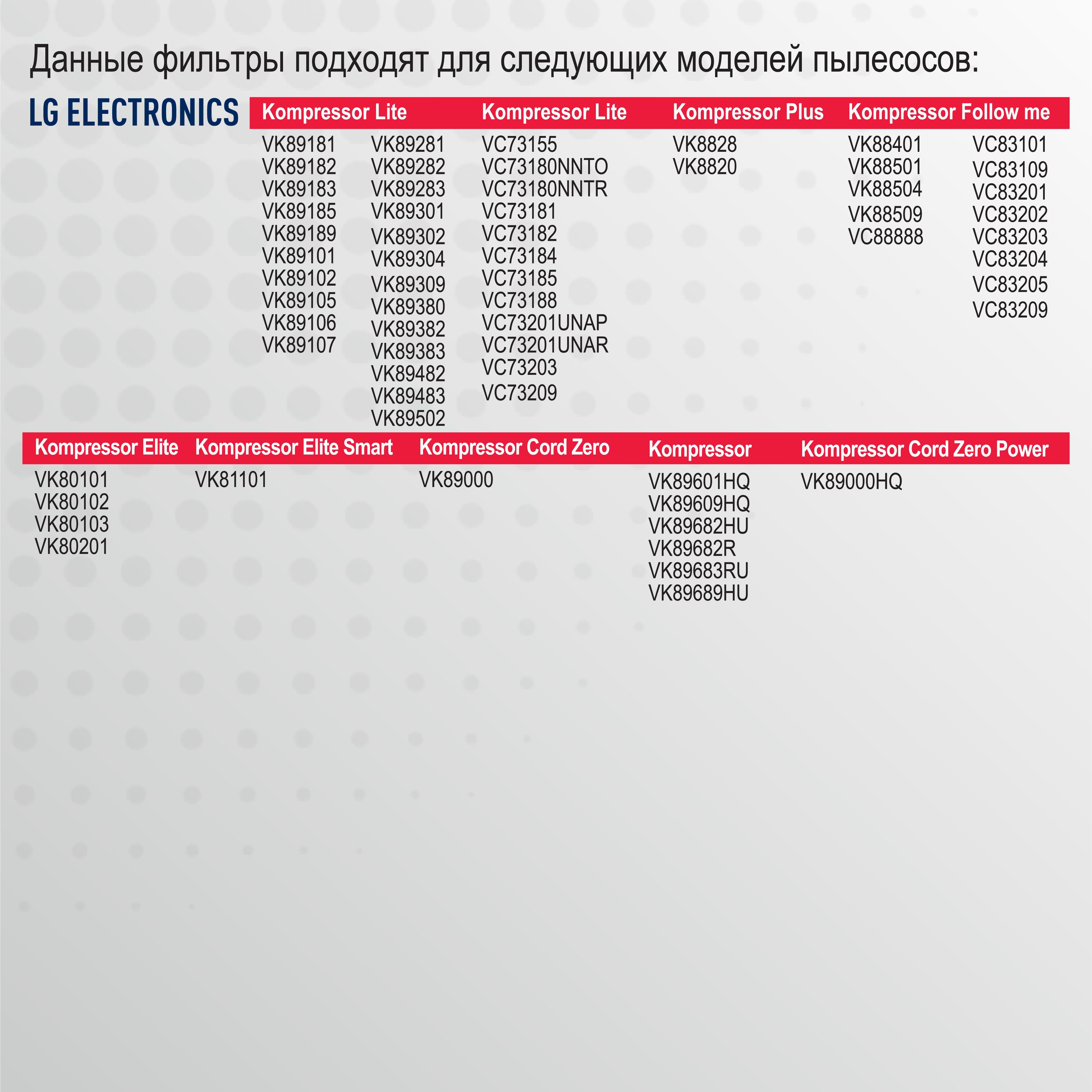 Описание: Моющийся фильтр пылесоса LG Kompressor: VK89601HQ, VK89609HQ, VK89682HU, VK89682R, VK89683RU, VK89689HU; Kompressor Cord Zero Power: VK89000HQ; Kompressor Lite: VK89181, VK89182, VK89183, VK89185, VK89189, VK89101, VK89102, VK89105, VK89106, VK89107, VK89281, VK89282, VK89283, VK89301, VK89302, VK89304, VK89309, VK89380, VK89382, VK89383, VK89482, VK89483, VK89502; Kompressor Cord Zero: VK89000; Kompressor Lite: VC73155, VC73180, VC73181, VC73182, VC73184, VC73185, VC73188, VC73189, VC73201, VC73203, VC73209; Kompressor Follow me: VC83101, VC83109, VC83201, VC83202, VC83203, VC83204, VC83205, VC83209; Kompressor Follow me: VK88401, VK88501, VK88504, VK88509, VC88888; Kompressor Plus: VK8828, VK8820; Kompressor Elite: VK80101, VK80102, VK80103, VK80201; Kompressor Elite Smart: VK81101. Оригинальный тип VPM-SGS, MDJ49551603 (губчатый зеленый), MDJ49523101 (черный), MDJ49551604 (губчатый синий), MDJ63305401 (сетчатый). Фильтр на пылесос LG обладает высшей степенью фильтрации, обеспечивает удаление пыли благодаря специальным свойствам фильтрующего материала. Этот незаменимый аксессуар для дома помогает избавиться от клещей, бактерий, паразитов, микроорганизмов и пыльцы, препятствуя возникновению и развитию заболеваний (кожа, аллергия, простудные заболевания). Уборка дома принесёт больше удовольствия и эффекта, если в Вашем пылесосе установлен новый фильтр. Topperr - недорогие товары для квартиры, дома, дачи, офиса европейского качества! Topperr 1126 Topperr FLG 89 Hepa фильтр - это высокоэффективный фильтр, который улавливает до 99,7% мельчайших частиц пыли, включая аллергены, бактерии и вирусы. Он является неотъемлемой частью пылесоса LG и обеспечивает чистый воздух в вашем доме. Если вы ищете аксессуары для своего пылесоса LG, то фильтр - это то, что вам нужно. Вы можете купить сменный фильтр для пылесоса LG, чтобы заменить старый или приобрести дополнительный запасной фильтр для своего пылесоса. FairDay предлагает различные виды фильтров, включая губку фильтр и HEPA фильтр для пылесосов LG. Кроме того, вы можете выбрать моторный фильтр или воздушный фильтр для своего пылесоса LG в зависимости от ваших потребностей. Фильтры для пылесоса LG доступны для моделей VC и VK, и они легко устанавливаются и заменяются. Вы также можете купить губки для пылесоса LG или губчатый фильтр, чтобы обеспечить дополнительную защиту от пыли и грязи. В целом, фильтры для пылесоса LG - это незаменимые аксессуары, которые обеспечивают чистоту и свежесть в вашем доме. Если вы ищете качественные и надежные фильтры для своего пылесоса LG, то вы можете быть уверены, что вы сделали правильный выбор.