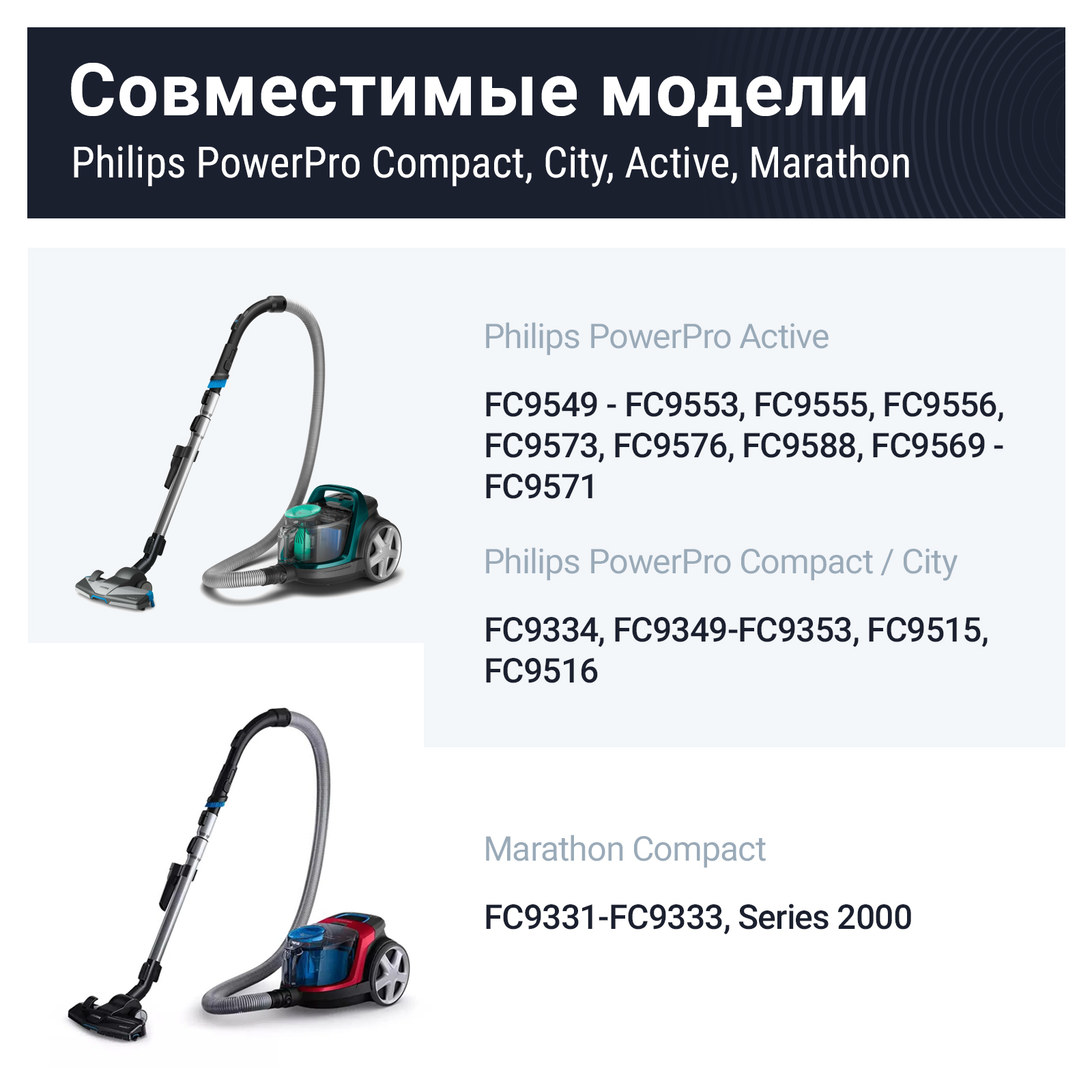 Совместимость:  Philips PowerPro Active FC9549 - FC9553, FC9555, FC9556, FC9573, FC9576, FC9588, FC9569 - FC9571 PowerPro Compact/PowerPro City FC9328 - FC9334, FC9349-FC9353, FC9515, FC9516, Marathon Compact FC9331-FC9333