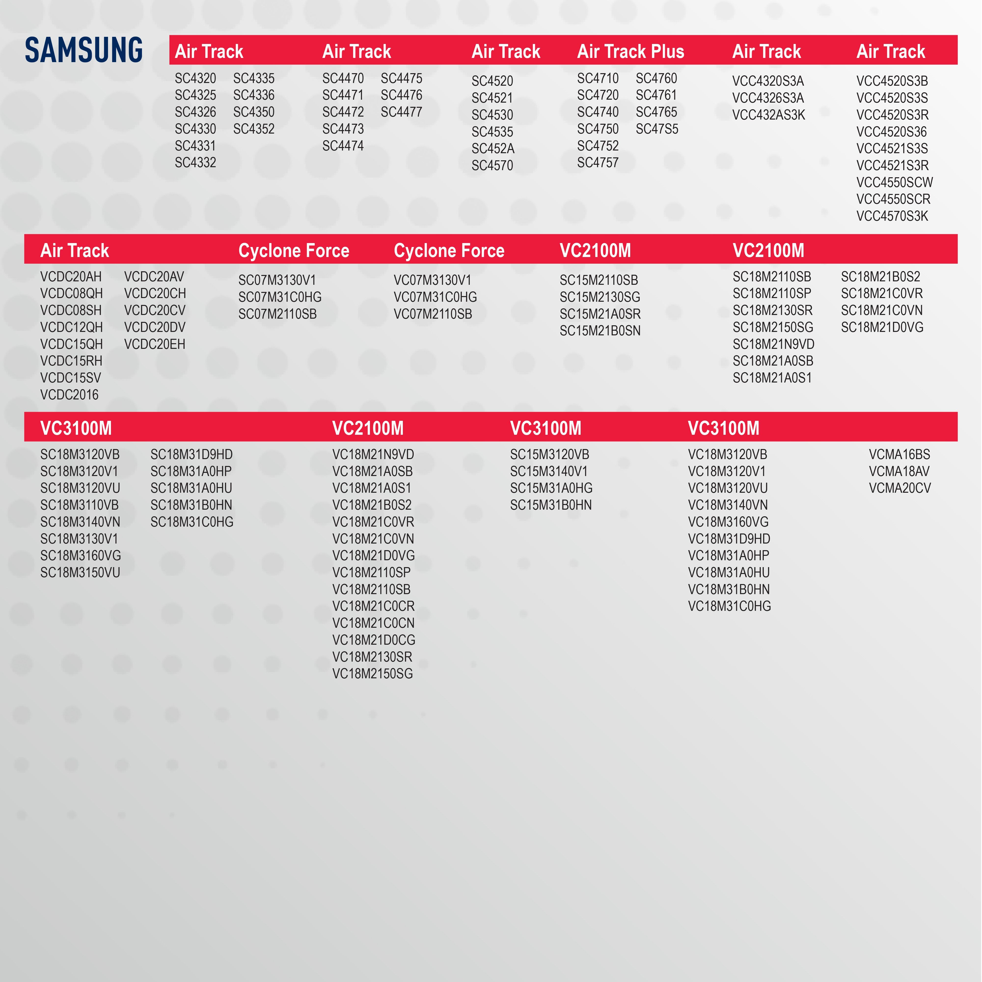 Описание: Фильтр для пылесоса SAMSUNG: Cyclone Force: VC07M2110SB, VC07M3130V1, VC07M31C0HG; Cyclone Force: SC07M2110SB, SC07M3130V1, SC07M31C0HG; Air Track: SC4520, SC4521, SC4530, SC4535, SC4570, SC452A; Air Track: VCC4520S3B, VCC4520S3S, VCC4520S3R, VCC4520S36, VCC4521S3S, VCC4521S3R, VCC4550SCW, VCC4550SCR, VCC4570S3K; Air Track: VCC4326S3A, VCC432AS3K, VCC4320S3A; Air Track: SC4320, SC4325, SC4326, SC4330, SC4331, SC4332, SC4335, SC4336, SC4350, SC4352; Air Track Plus: SC4710, SC4720, SC4740, SC4750, SC4752, SC4757, SC4760, SC4761, SC4765, SC47S5; Air Track: SC4470, SC4471, SC4472, SC4473, SC4474, SC4475, SC4476, SC4477; Air Track: VCDC20AV, VCCD20AH, VCDC20EH, VCDC20DV, VCDC20CH, VCDC20CV, VCDC2016, VCDC15RH, VCDC15SV, VCDC15QH, VCDC12QH, VCDC08QH, VCDC08SH; VCMA16BS, VCMA18AV, VCMA20CV; VC2100M: VC18M21N9VD, VC18M21A0SB, VC18M21A0S1, VC18M21B0S2, VC18M21C0CR, VC18M21C0CN, VC18M21C0VR, VC18M21C0VN, VC18M21D0CG, VC18M21D0VG, VC18M2110SP, SB, VC18M2130SR, VC18M2150SG; VC2100M: SC18M2110SB, SC18M2110SP, SC18M2130SR, SC18M2150SG, SC18M21N9VD, SC18M21A0SB, SC18M21A0S1, SC18M21B0S2, SC18M21C0VR, SC18M21C0VN, SC18M21D0VG; VC2100M: SC15M2110SB, SC15M2130SG, SC15M21A0SR, SC15M21B0SN; VC3100M: VC18M3120VB, VC18M3120V1, VC18M3120VU, VC18M3140VN, VC18M3160VG, VC18M31D9HD, VC18M31A0HP, VC18M31A0HU, VC18M31B0HN, VC18M31C0HG; VC3100M: SC18M3120VB, SC18M3120V1, SC18M3120VU, SC18M3110VB, SC18M3140VN, SC18M3130V1, SC18M3160VG, SC18M3150VU, SC18M31D9HD, SC18M31A0HP, SC18M31A0HU, SC18M31B0HN, SC18M31C0HG; VC3100M: SC15M3120VB, SC15M3140V1, SC15M31A0HG, SC15M31B0HN. Фильтр для пылесоса обладает высшей степенью фильтрации, обеспечивает удаление пыли благодаря специальным свойствам фильтрующего материала. Этот незаменимый аксессуар для дома помогает избавиться от клещей, бактерий, паразитов, микроорганизмов и пыльцы, препятствуя возникновению и развитию заболеваний (кожа, аллергия, простудные заболевания). Уборка дома принесёт больше удовольствия и эффекта, если в Вашем пылесосе установлен новый фильтр. Topperr - недорогие товары для квартиры, дома, дачи, офиса европейского качества! При выборе фильтра для пылесоса обратите внимание: Topperr FSM 451 (тип DJ63-00672D, VCA-VH43) - hepa фильтр (хепа фильтр) для пылесоса Samsung, Topperr FSM 45 (тип DJ97-01040B, VCA-VM45P) - губчатый и сетчатый фильтр на пылесос Самсунг. Topperr 1111 Topperr FSM 45 Topperr 1147 Topperr FSM 451