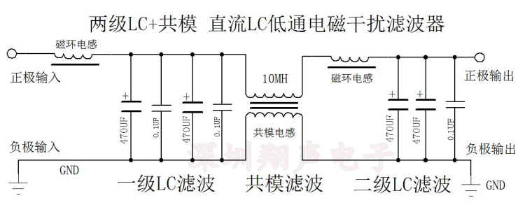 Схема состоит из трехступенчатой фильтрации, первая часть представляет собой одноступенчатую схему LC-фильтра, вторая часть-синфазный фильтр электромагнитных помех, А третья часть представляет собой двухступенчатую схему LC-фильтра.