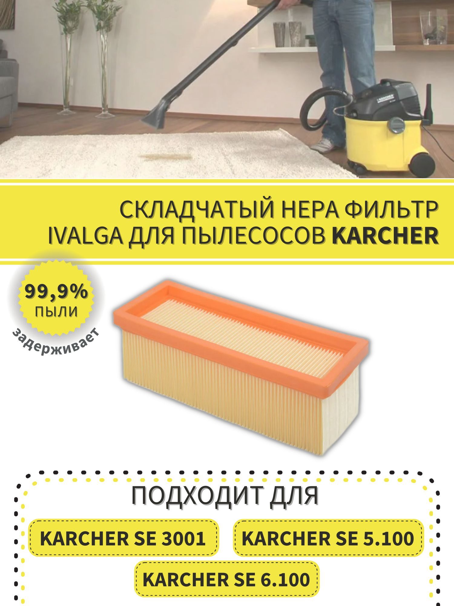 Описание: "Фильтр складчатый подходит для следующих моделей пылесосов Karcher: