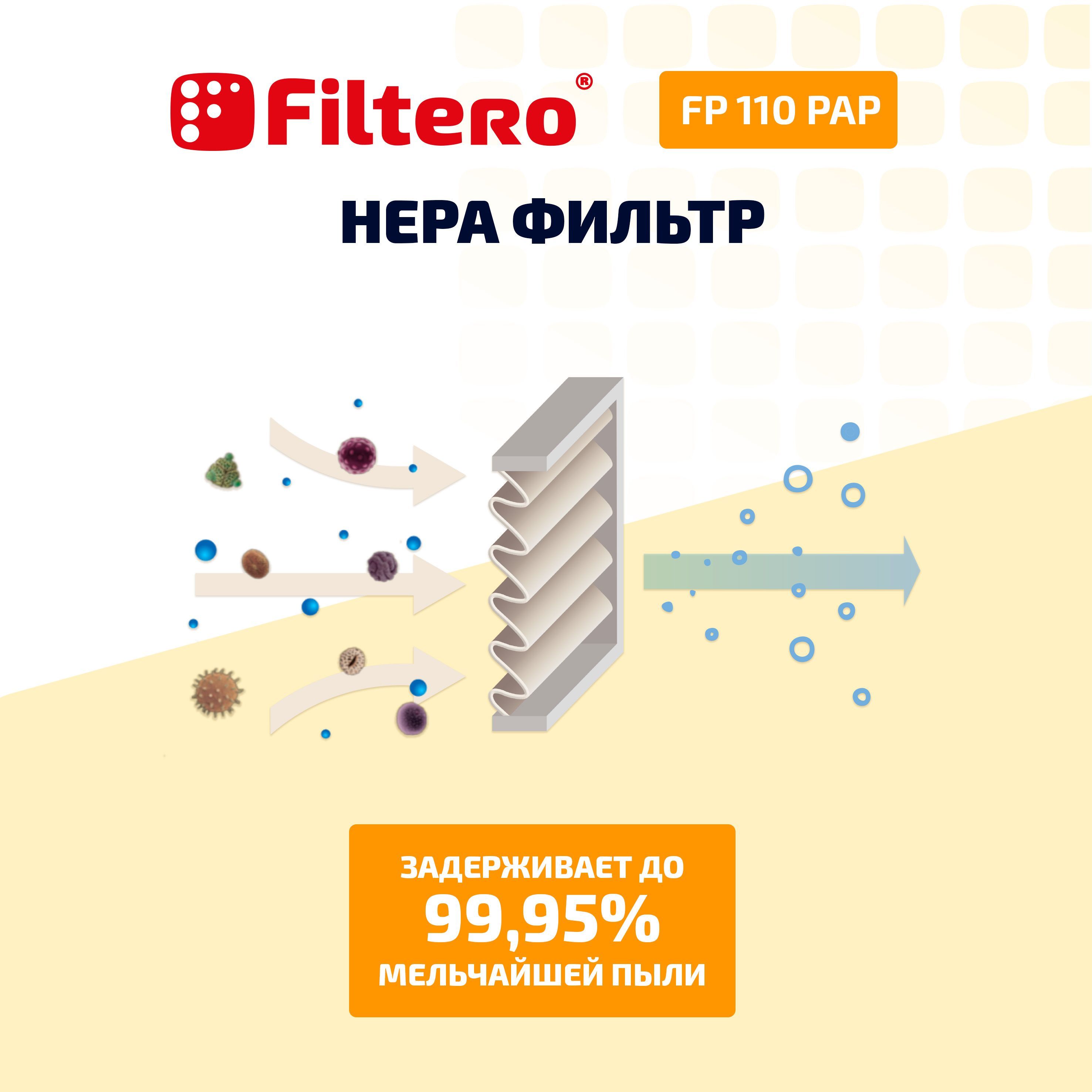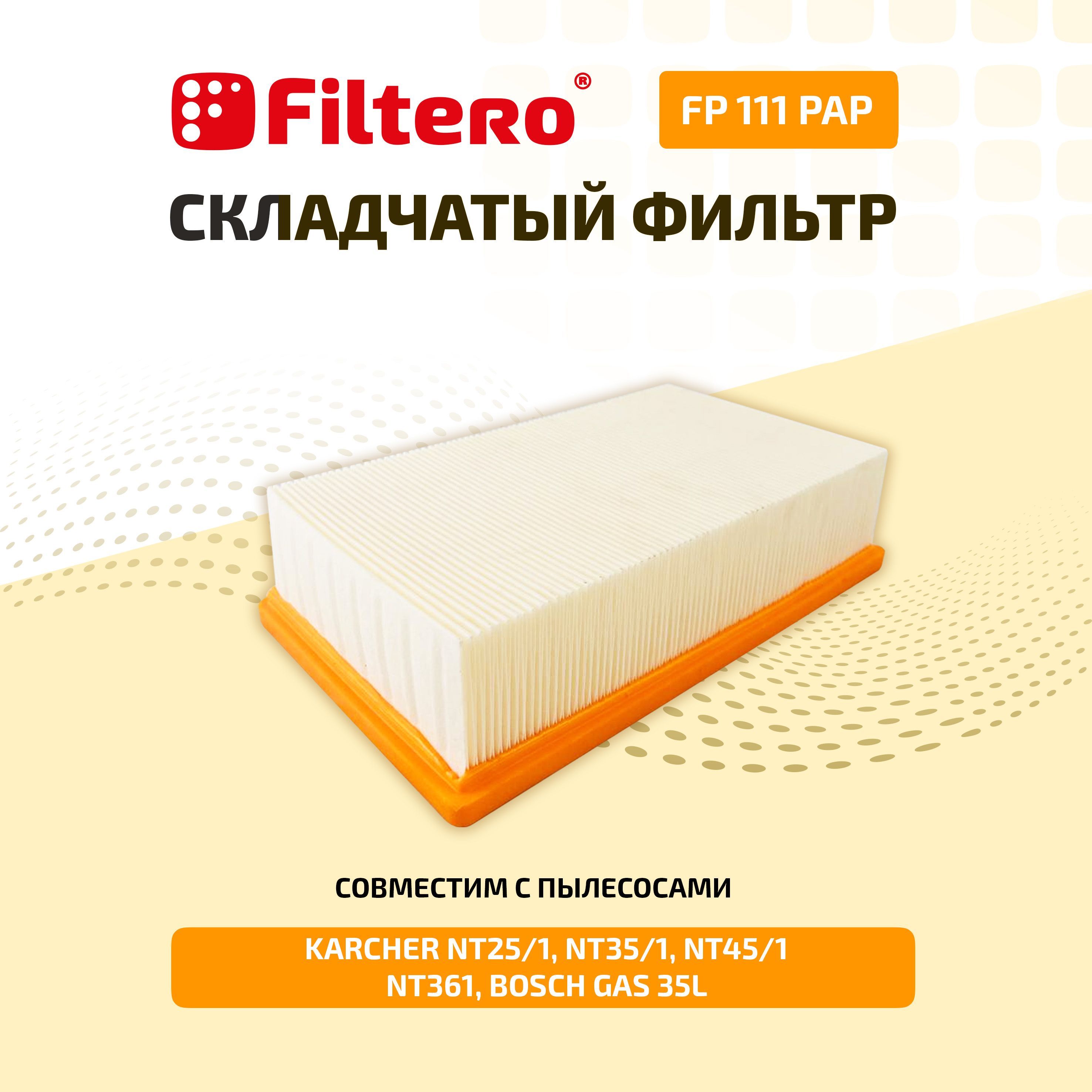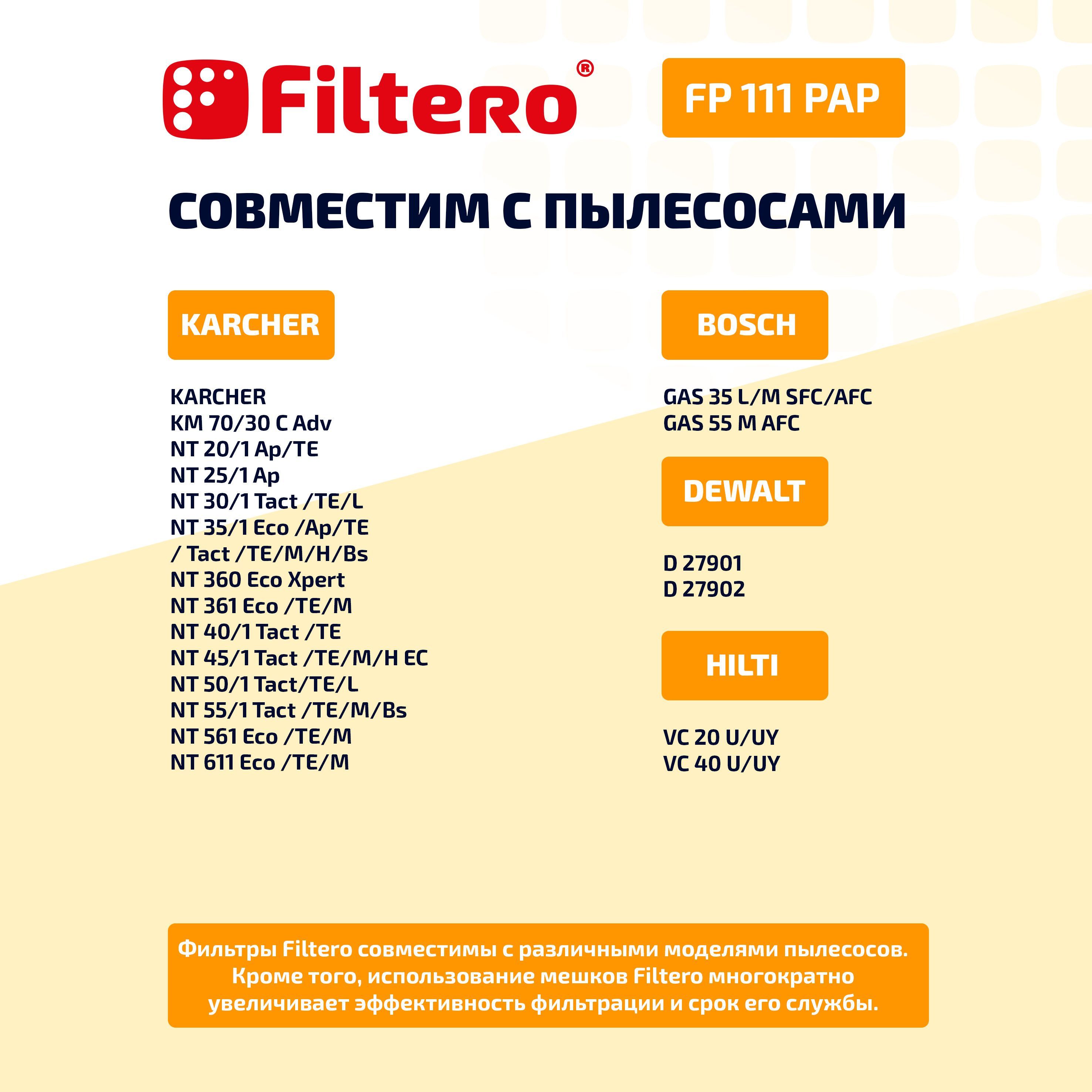 Описание: Фильтр Filtero FP 111 PAP Pro обладает высокой степенью фильтрации, что позволяет использовать пылесос для работы в режимах сухой и влажной уборки и экономит время на смену фильтра.Данный фильтр препятствует выходу мельчайших частиц из пылесоса в помещение, максимальная эффективность для пыли класса М. Эффективность фильтрации и срок службы фильтра многократно увеличиваются с использованием мешков Filtero.СовместимостьKARCHER: