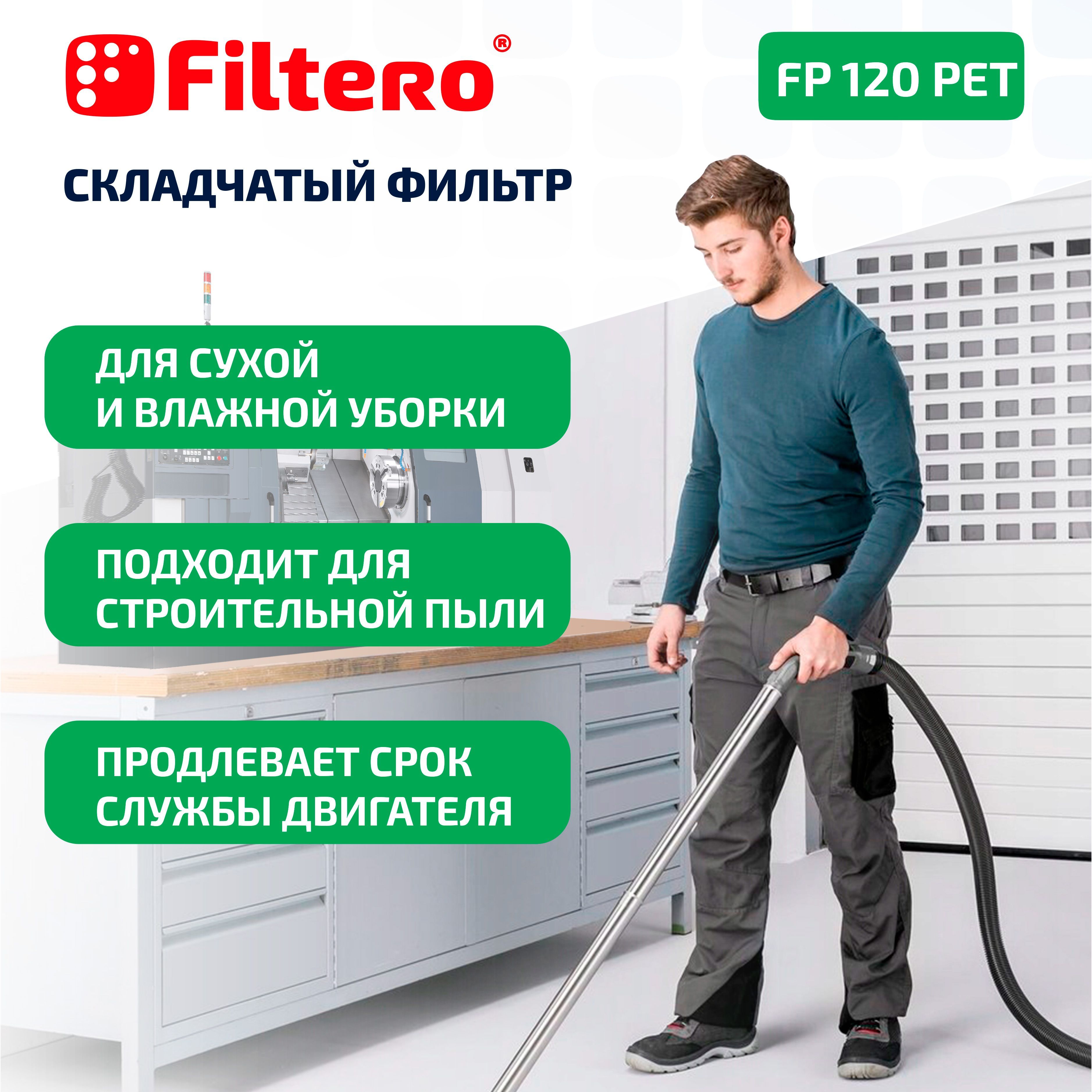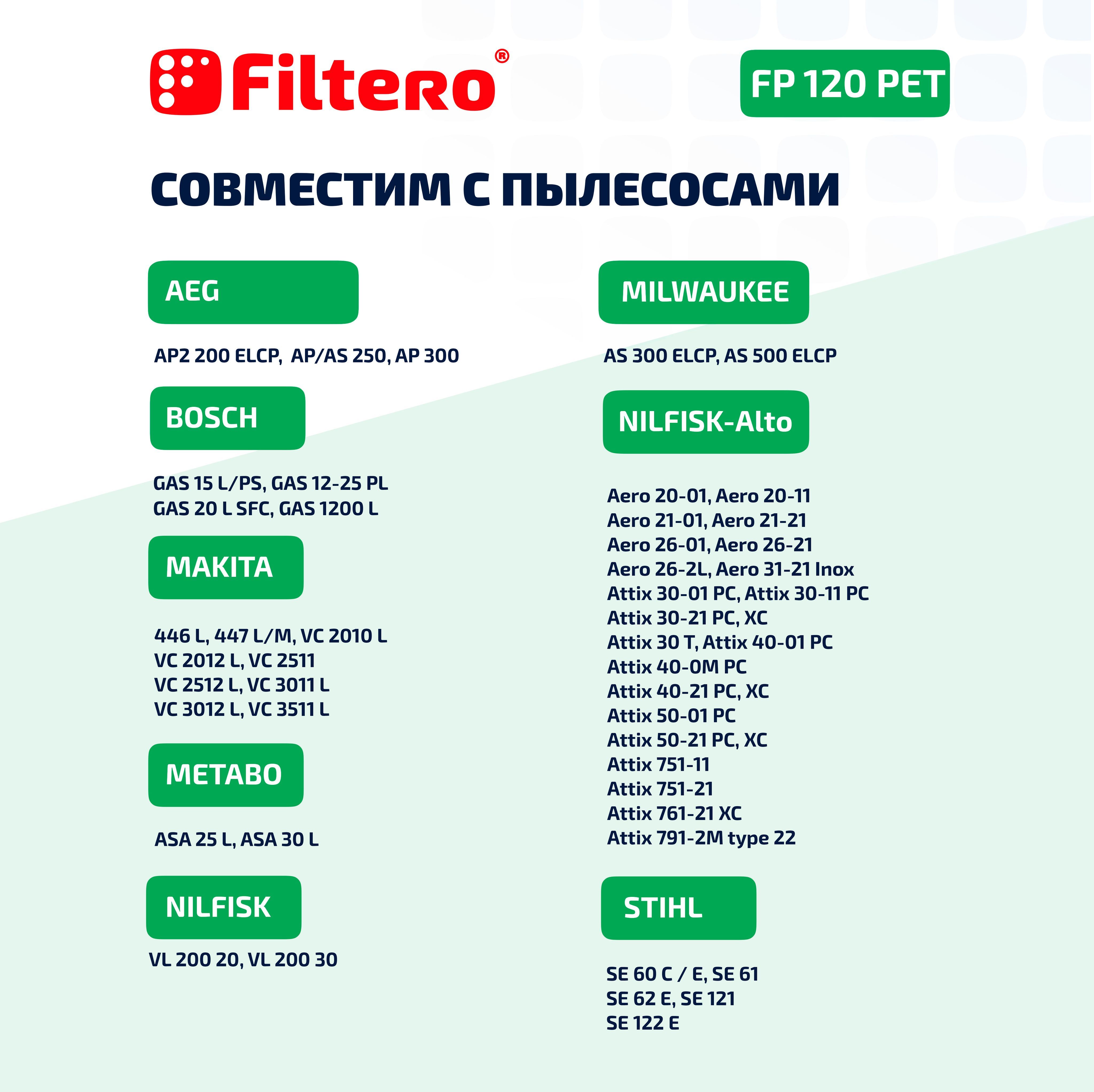Описание: Фильтр Filtero FP 120 PET Pro обладает высокой степенью фильтрации и не боится влаги, что позволяет использовать пылесос для работы в режимах сухой и влажной уборки и экономит время на смену фильтра.