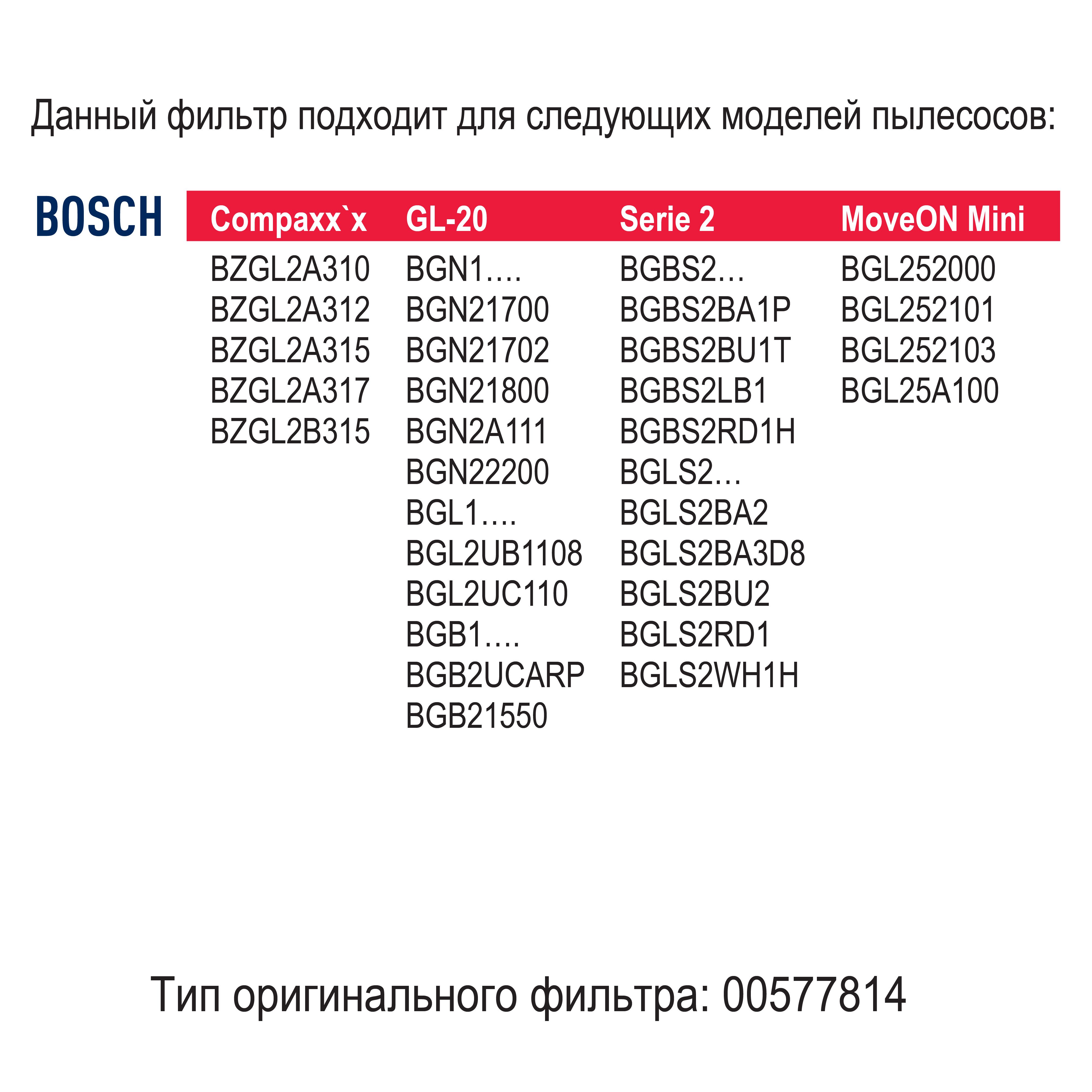 Описание: Защитный фильтр мотора для пылесосов BOSCH: Serie 2: BGLS2BA2, BGLS2BA3D8, BGLS2BU2, BGLS2RD1, BGLS2WH1H, BGBS2BA1P, BGBS2BU1T, BGBS2LB1, BGBS2RD1H; MoveON Mini: BGL252000, BGL252101, BGL252103, BGL25A100; GL-20 Serie 2: BGN1…, BGN21700, BGN21702, BGN21800, BGN22200, BGN2A111, BGL1…, BGL2UC110, BGL2UB1108, BGB1…, BGB2UCARP, BGB21550; Compaxx`x: BZGL2A310, BZGL2A312, BZGL2A317, BZGL2A315, BZGL2B315 (оригинальный тип 00577814 голубой). ). Фильтр для пылесоса обладает высшей степенью фильтрации, обеспечивает удаление пыли благодаря специальным свойствам фильтрующего материала. Этот незаменимый аксессуар для дома помогает избавиться от клещей, бактерий, паразитов, микроорганизмов и пыльцы, препятствуя возникновению и развитию заболеваний (кожа, аллергия, простудные заболевания). Уборка дома принесёт больше удовольствия и эффекта, если в Вашем пылесосе установлен новый фильтр. Topperr - недорогие товары для квартиры, дома, дачи, офиса европейского качества!