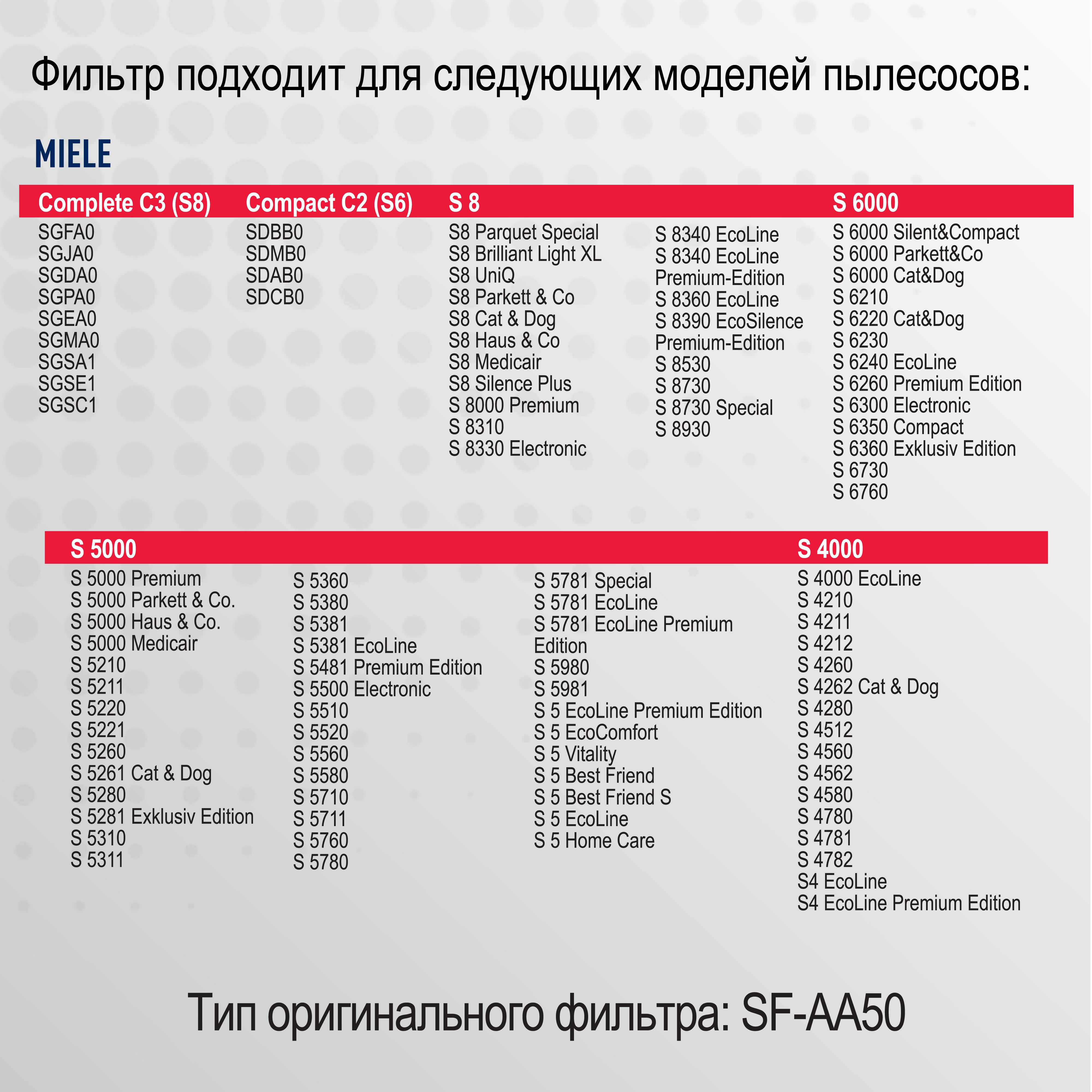 Описание: HEPA-фильтр для пылесосов MIELE. Подходит для моделей: Complete C3 (S8): SGFA0, SGFA3, SGJA0, SGDA0, SGDA3, SGPA0, SGEA0, SGEA3, SGMA0, SGSA1, SGSA3, SGSE1, SGSC1; Compact C2 (S6), SDBB0, SDMB0, SDAB0, SDCB0, SDCB3; S 8: S8 Parquet Special, S8 Brilliant Light XL, S8 UniQ, S8 Parkett & Co, S8 Cat & Dog, S8 Haus & Co, S8 Medicair, S8 Silence Plus, S 8000 Premium, S 8310, S 8330 Electronic, S 8340 EcoLine, S 8340 EcoLine Premium-Edition, S 8360 EcoLine, S 8390 EcoSilence Premium-Edition, S 8530, S 8730, S 8730 Special, S 8930; S 6000: S 6000 Silent&Compact, S 6000 Parkett&Co, S 6000 Cat&Dog, S 6210, S 6220 Cat&Dog, S 6230, S 6240 EcoLine, S 6260 Premium Edition, S 6300 Electronic, S 6350 Compact, S 6360 Exklusiv Edition, S 6730, S 6760; S 5000: S 5000 Premium, S 5000 Parkett & Co. S 5000 Haus & Co. S 5000 Medicair, S 5210, S 5211, S 5220, S 5221, S 5260, S 5261 Cat & Dog, S 5280, S 5281 Exklusiv Edition, S 5310, S 5311, S 5360, S 5380, S 5381, S 5381 EcoLine, S 5481 Premium Edition, S 5500 Electronic, S 5510, S 5520, S 5560, S 5580, S 5710, S 5711, S 5760, S 5780, S 5781 Special, S 5781 EcoLine, S 5781 EcoLine Premium Edition, S 5980, S 5981, S 5 EcoLine Premium Edition, S 5 EcoComfort, S 5 Vitality, S 5 Best Friend, S 5 Best Friend S, S 5 EcoLine, S 5 Home Care; S 4000: S 4000 EcoLine, S 4210, S 4211, S 4212, S 4260, S 4262 Cat & Dog, S 4280, S 4512, S 4560, S 4562, S 4580, S 4780, S 4781, S 4782, S4 EcoLine, S4 EcoLine Premium Edition (оригинальный тип ACTIVE AIR CLEAN SF-AA50 Фильтр для пылесоса обладает высшей степенью фильтрации, обеспечивает удаление пыли благодаря специальным свойствам фильтрующего материала. Этот незаменимый аксессуар для дома помогает избавиться от клещей, бактерий, паразитов, микроорганизмов и пыльцы, препятствуя возникновению и развитию заболеваний (кожа, аллергия, простудные заболевания). Уборка дома принесёт больше удовольствия и эффекта, если в Вашем пылесосе установлен новый фильтр. Topperr - недорогие товары для квартиры, дома, дачи, офиса европейского качества!
