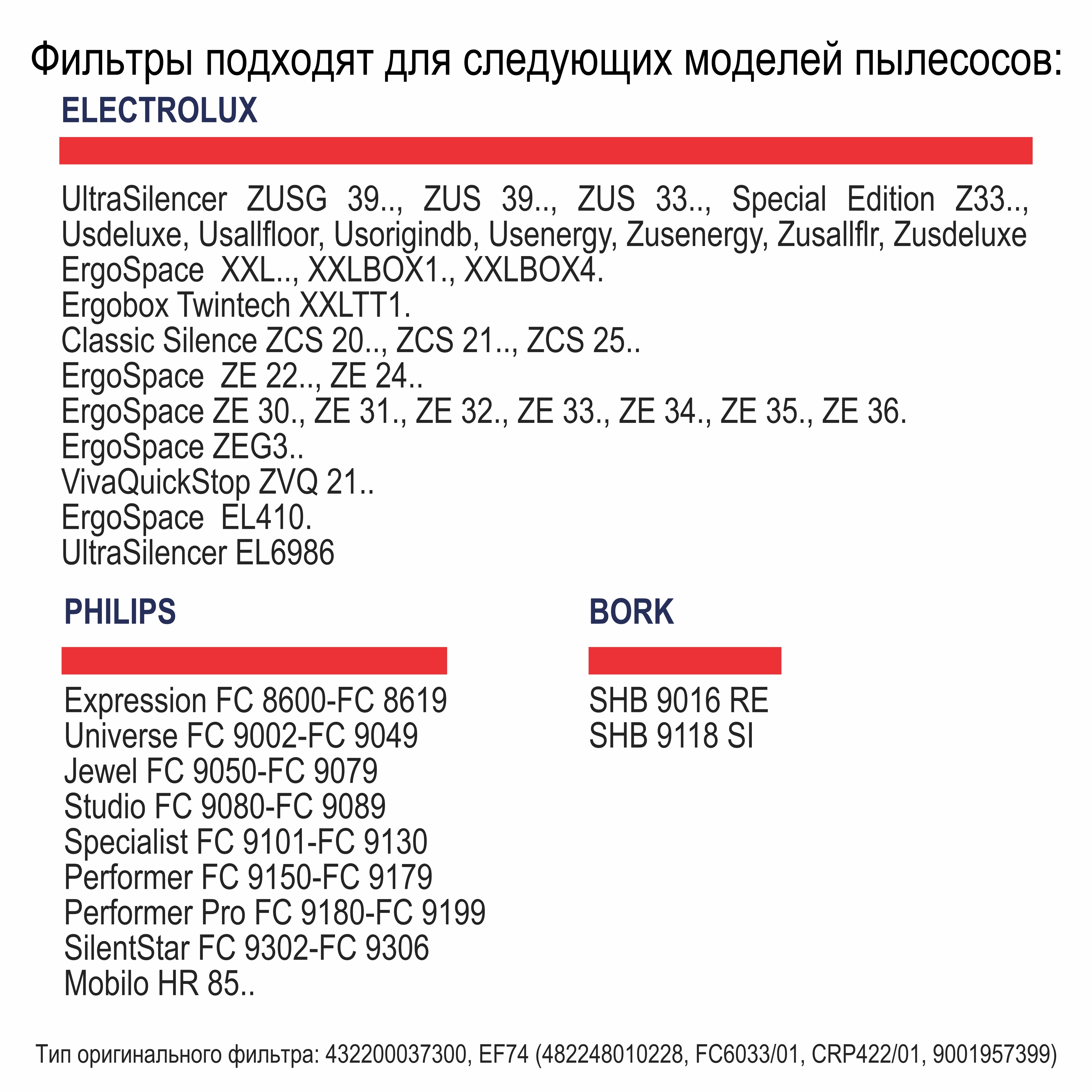 Тип оригинального фильтра: 432200037300, EF74 (482248010228, FC6033/01, CRP422/01, 9001957399)
