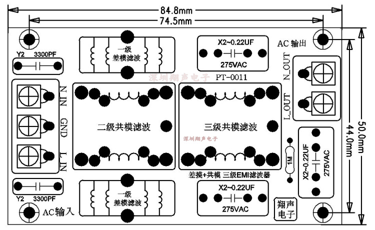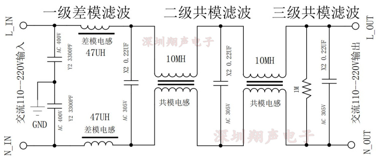Трехступенчатый композитный (1-ступенчатый дифференциальный режим + 2-ступенчатый синфазный режим) схема фильтра EMI EM1, благодаря использованию трехступенчатой (также известной как трехсекционная) фильтрации, таким образом, фильтрация шума более эффективна.