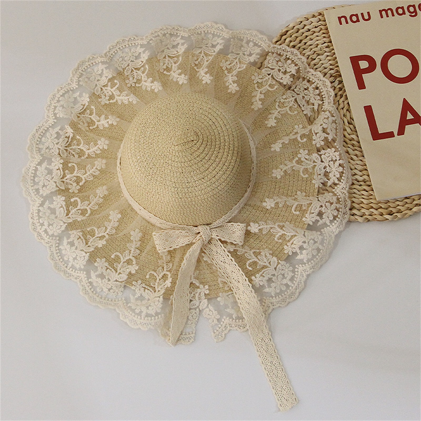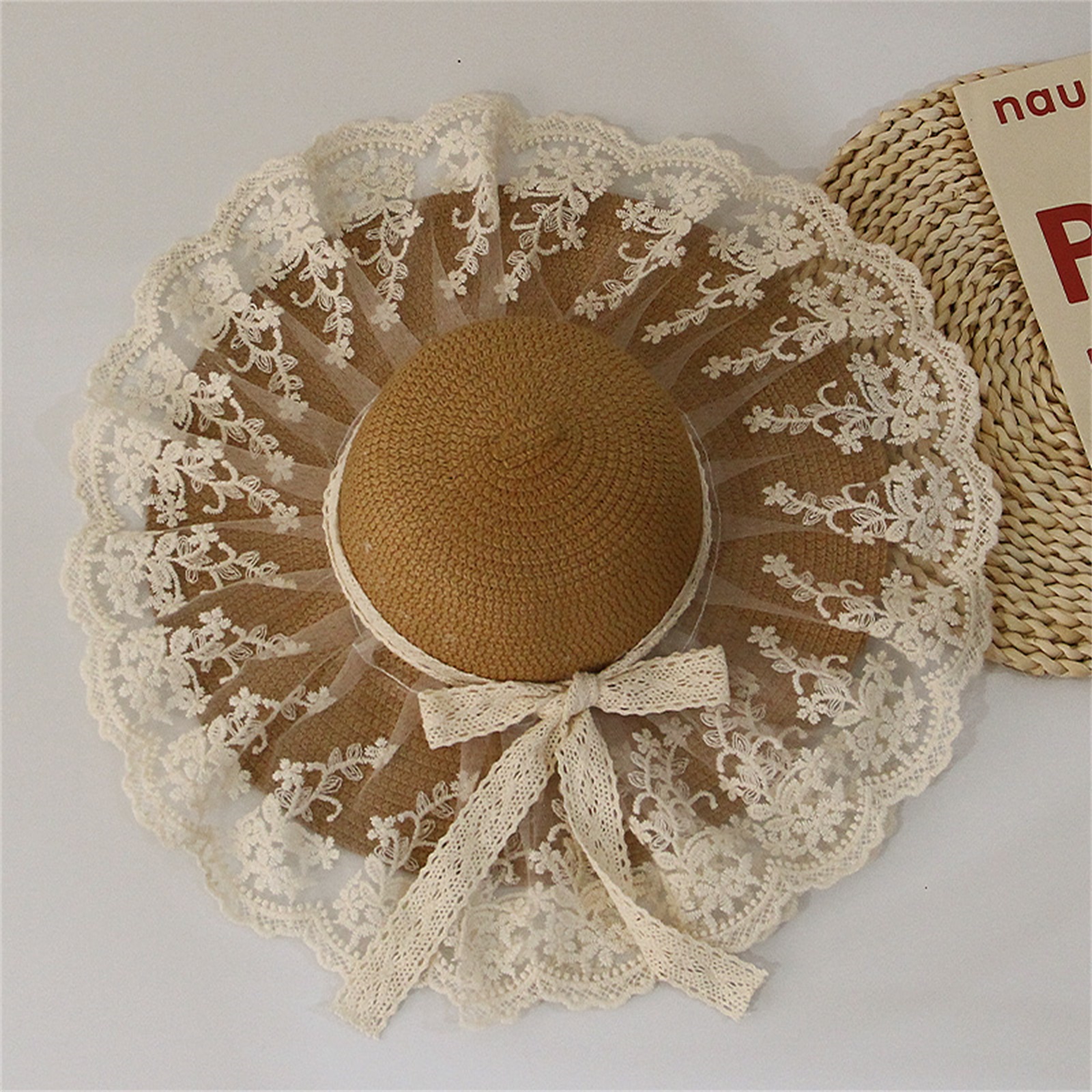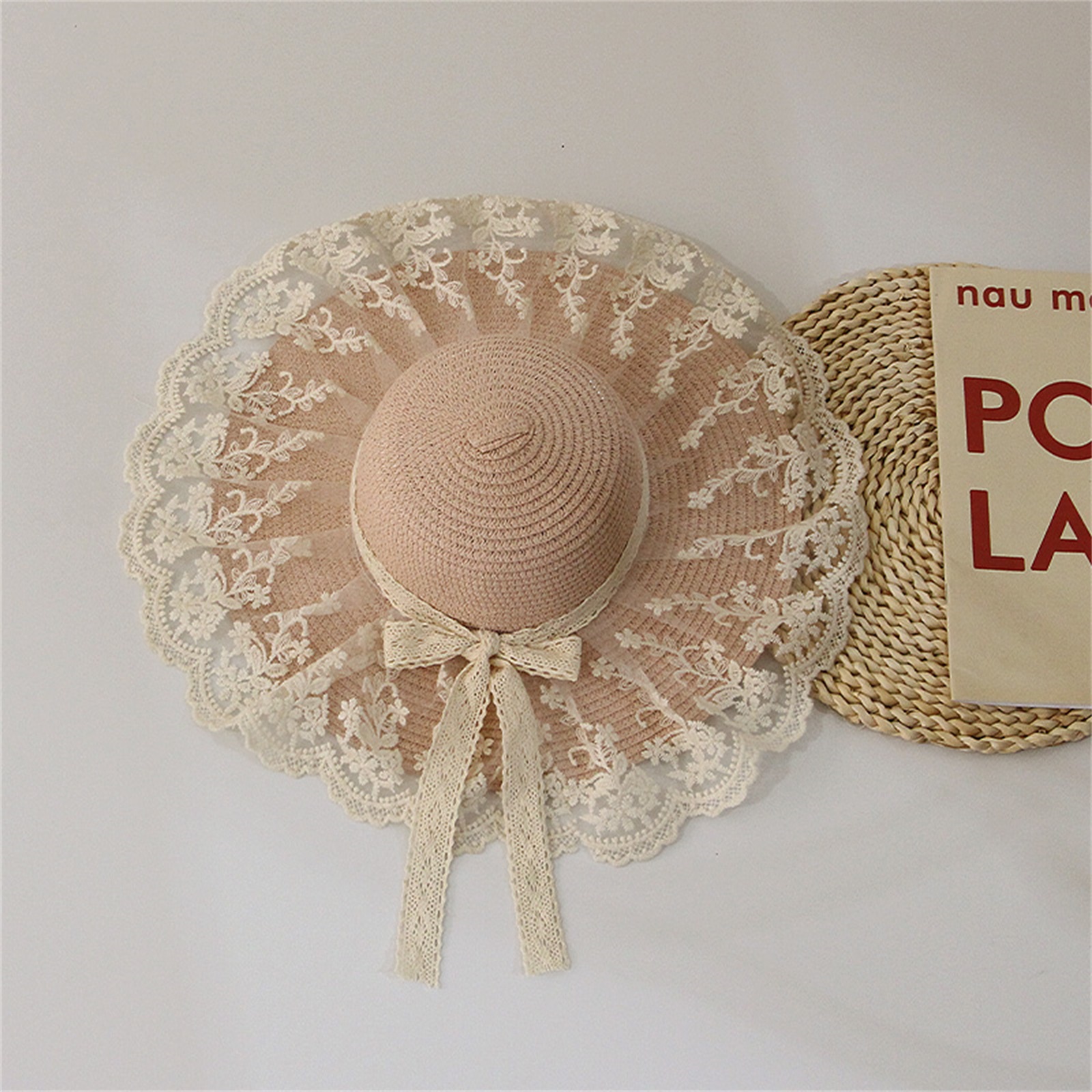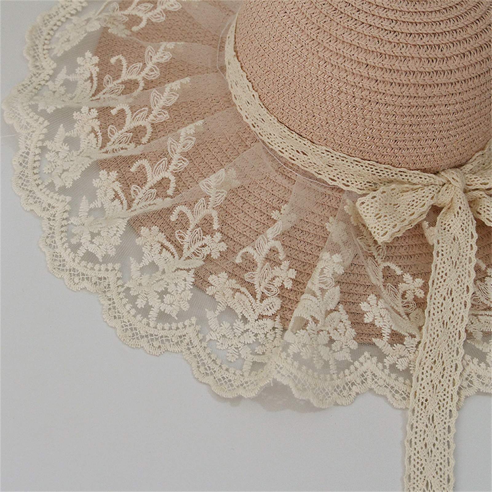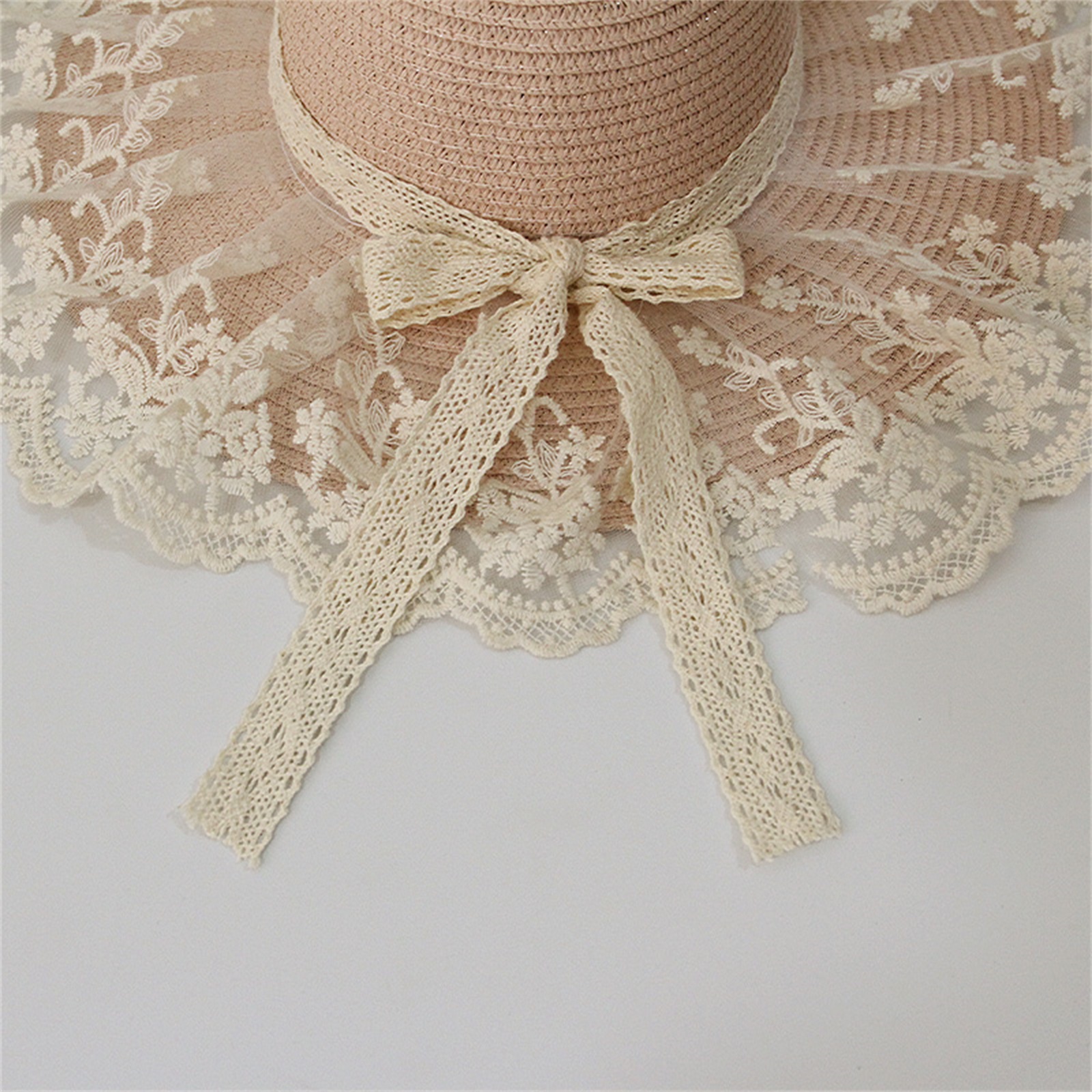 Описание: Уличная Солнцезащитная шляпа для маленьких девочек, кружевная вышивка, украшение в виде банта, высокий Топ с широкими полями, защита от ультрафиолета