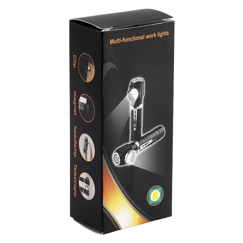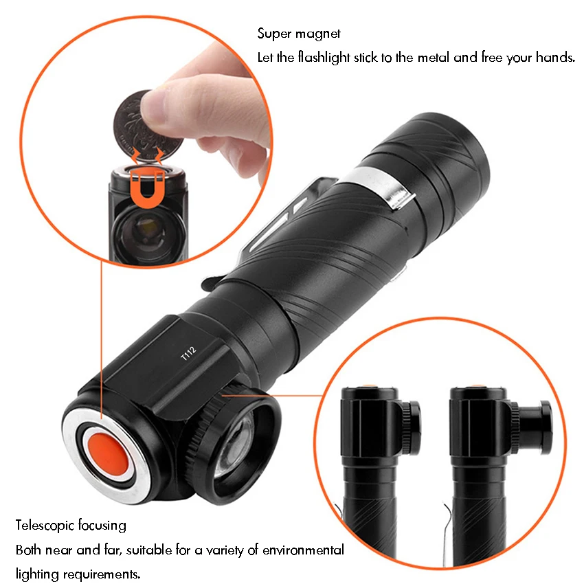 Функция: 4 режима (сильный свет/слабый свет/стробоскопическая вспышка/медленная вспышка (Длительное нажатие в течение 0,5 секунды для медленной вспышки) телескопическая фокусировка, магнит на части переключателя, использование зажима и магнитной задней крышки для фары, фонарика, прямоугольного освещения Различные методы освещения, такие как лампы.