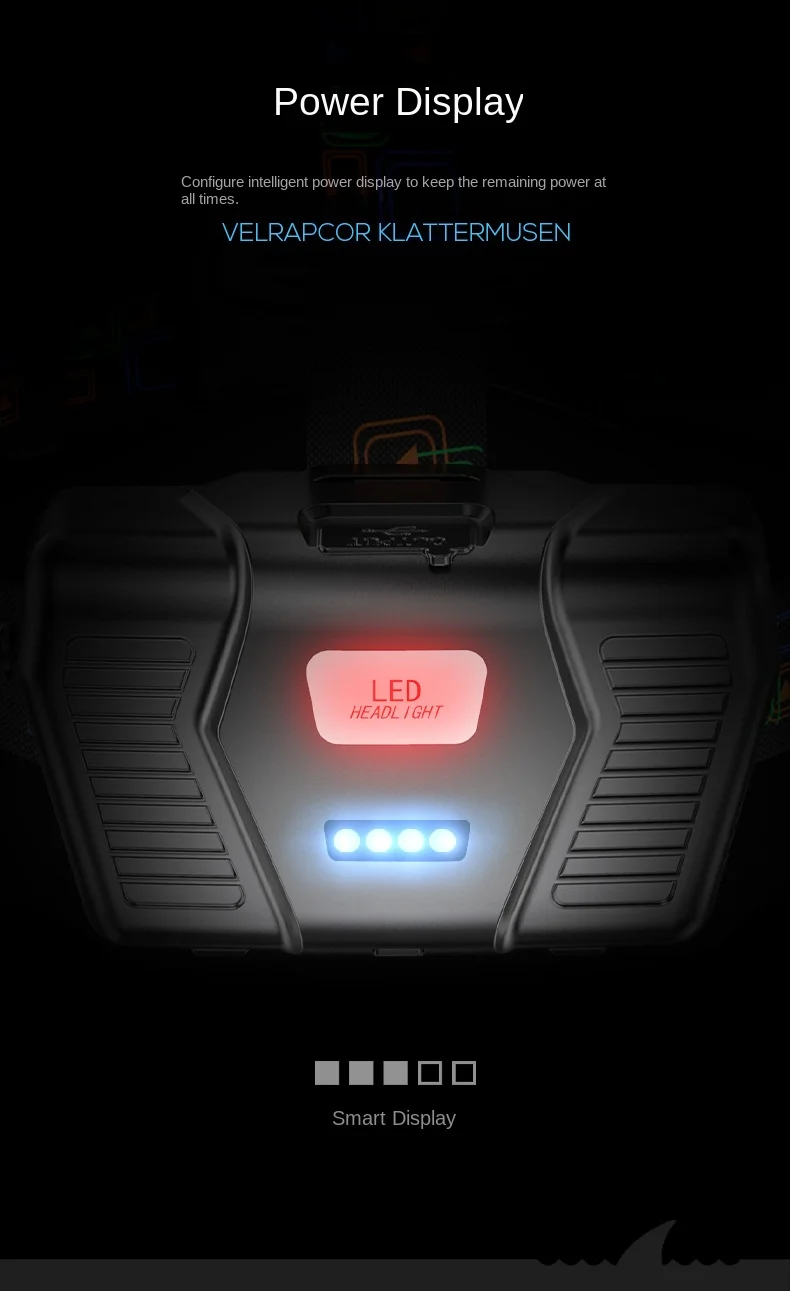 • Дисплей питания:Фара имеет индикатор питания, который показывает уровень заряда батареи, позволяя узнать, когда пришло время подзарядить устройство.