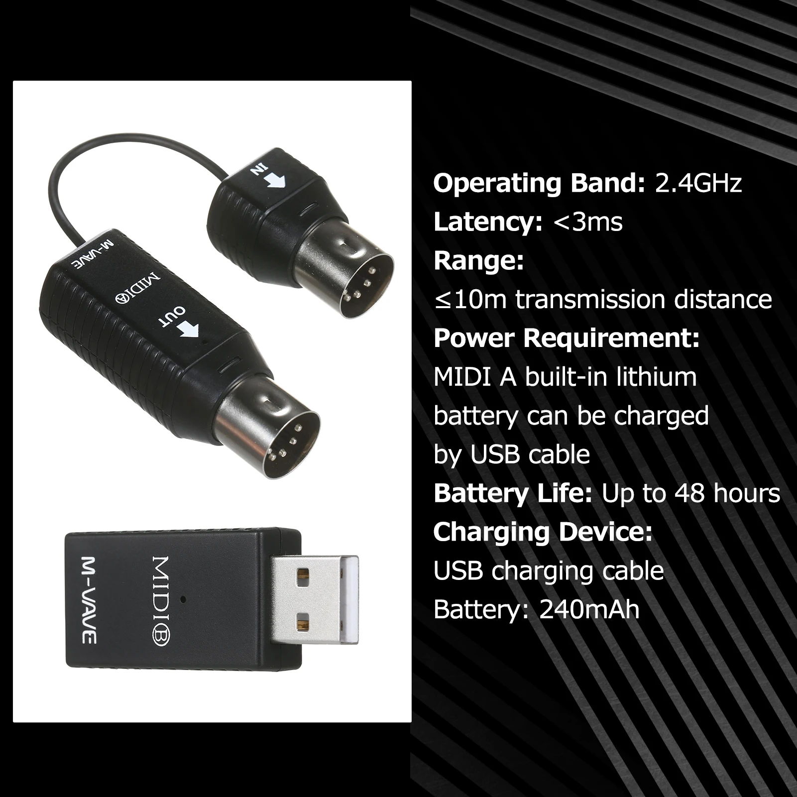 Сверхнизкая задержка: система MIDI напрямую реализует беспроводной протокол MIDI в прошивке, поэтому время задержки сокращается до 3 миллисекунд, интеллектуально оптимизированный алгоритм подключения.