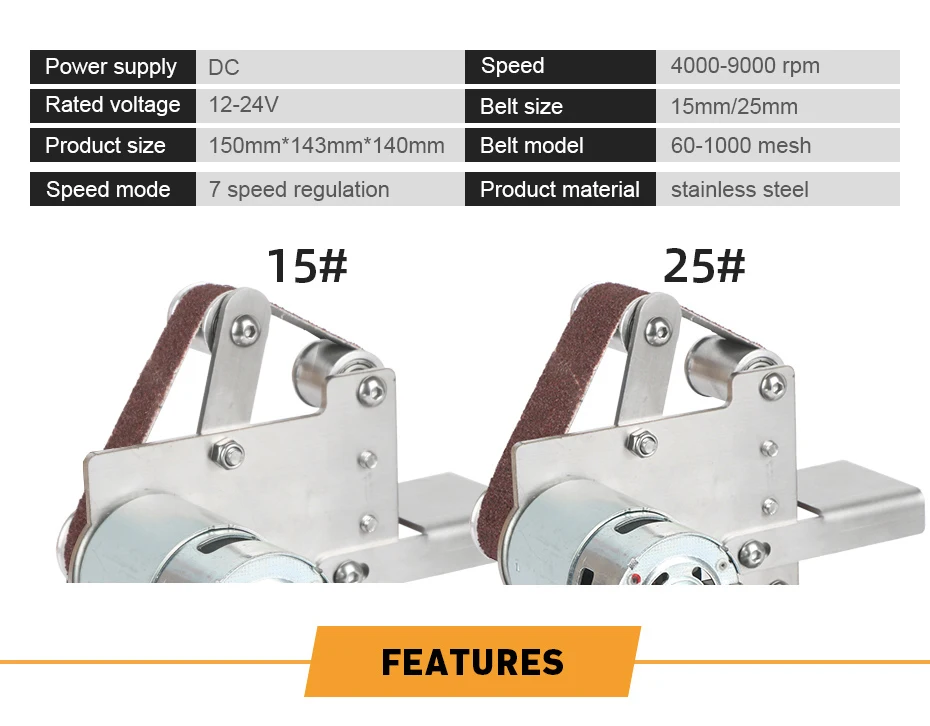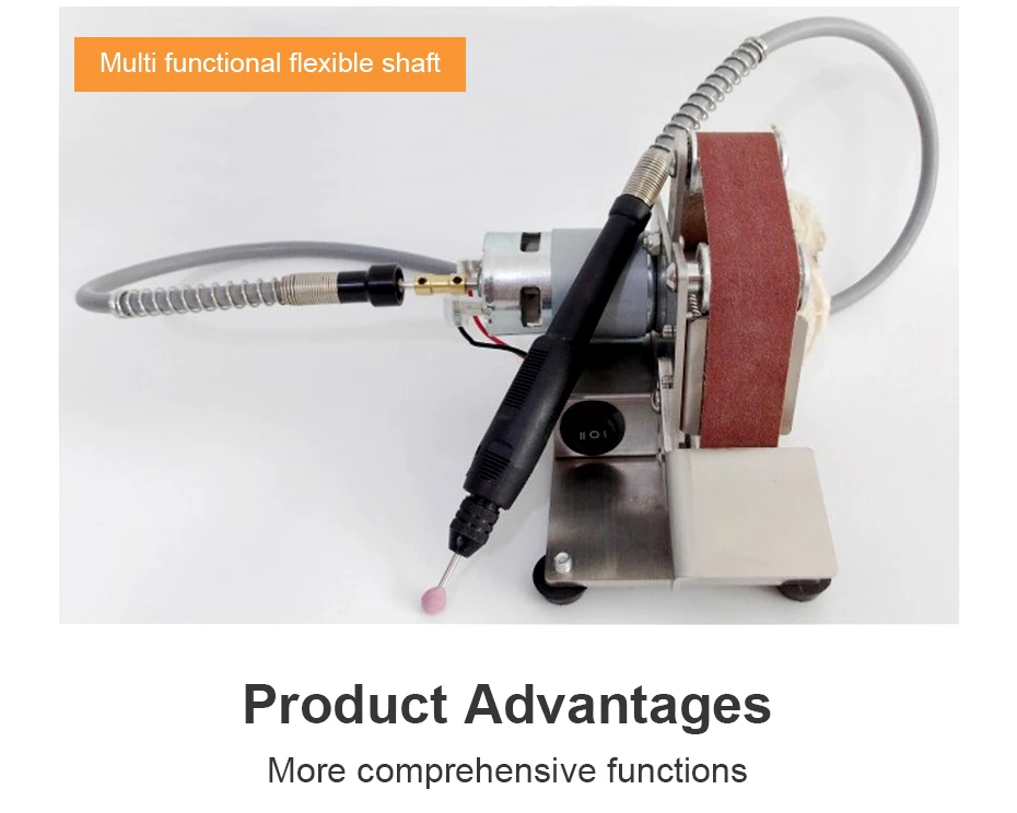 Это многофункциональный ленточный шлифовальный станок, мини портативный, низкий уровень шума, может использоваться для высокоскоростного стального сверла грубого шлифования, кромки лезвия, тонкого шлифования вольфрамовой стали токарного инструмента, полировки корень дерева Бодхи и т. Д., простой в установке и эксплуатации, это домашний инструмент DIY.