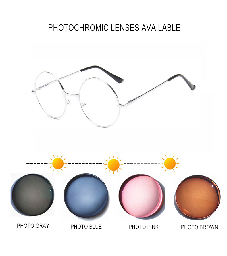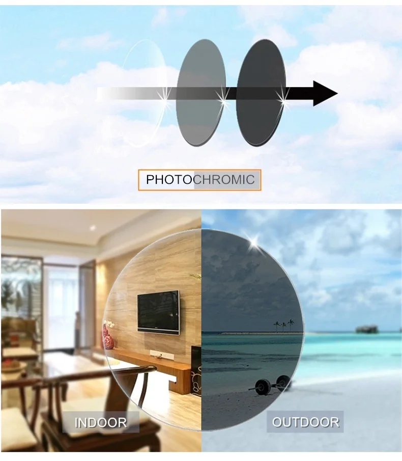 О фотохромные линзы, они будут прозрачными и бесцветными в помещении или в темных местах, но они изменят цвет на открытом воздухе или на солнце, чтобы защитить ваши глаза от сильного светильник.