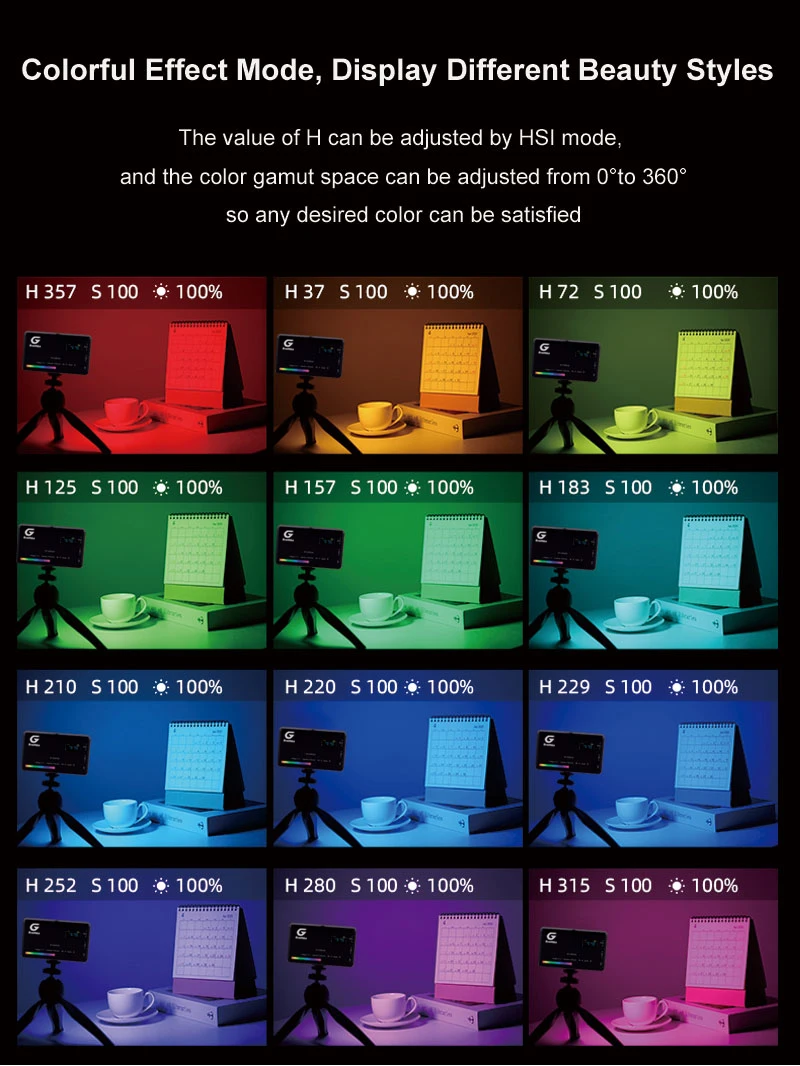 Наслаждайтесь широким диапазоном цветов с этой светодиодной видеолампой, которая может отображать оттенки от 0 до 360 градусов.