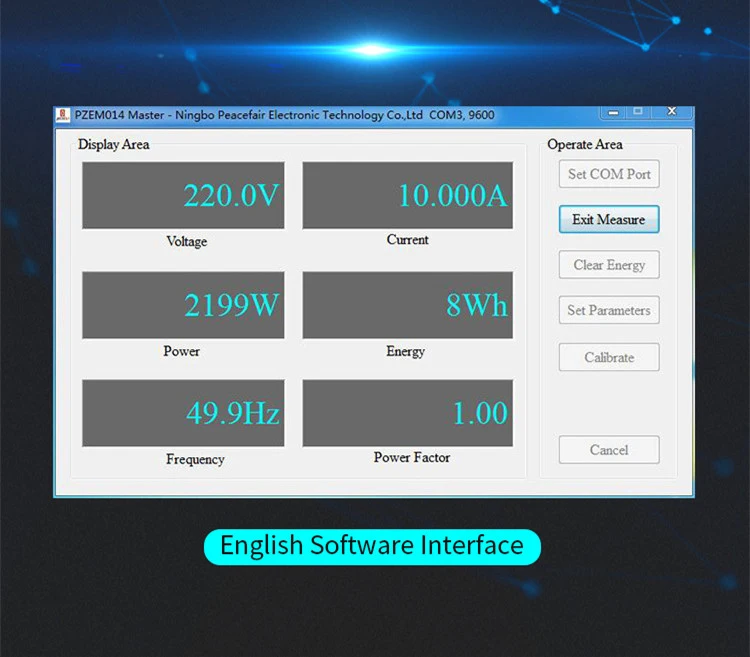 2. Программное обеспечение новое, у нас есть английское программное обеспечение, такое же, как PZEM-014,016, протокол связи меняется на Modbus-RTU, интерфейс дисплея изменен. Теперь он может проверять параметры напряжения, тока, мощности, коэффициента мощности, частоты и энергии 6.