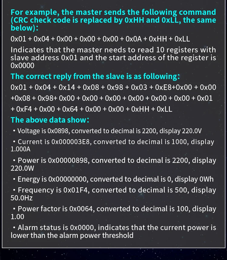 На прикладном уровне для связи используется протокол Modbus-RTU. В настоящее время он поддерживает только коды функций, такие как 0x03 (чтение регистра удержания), 0x04 (чтение входного регистра), 0x06 (запись одного регистра), 0x41 (калибровка), 0x42 (сброс энергии). и т. д.