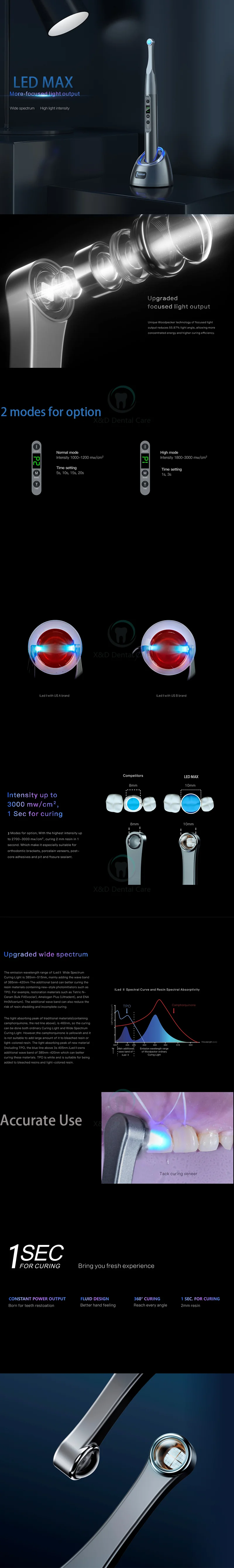 Стоматологический полимеризатор iLed Max 1Sec Деревянный дятел Стоматология Фотополимеризатор Светодиодный беспроводной 3000 МВт/см² Модернизированный сфокусированный световой поток