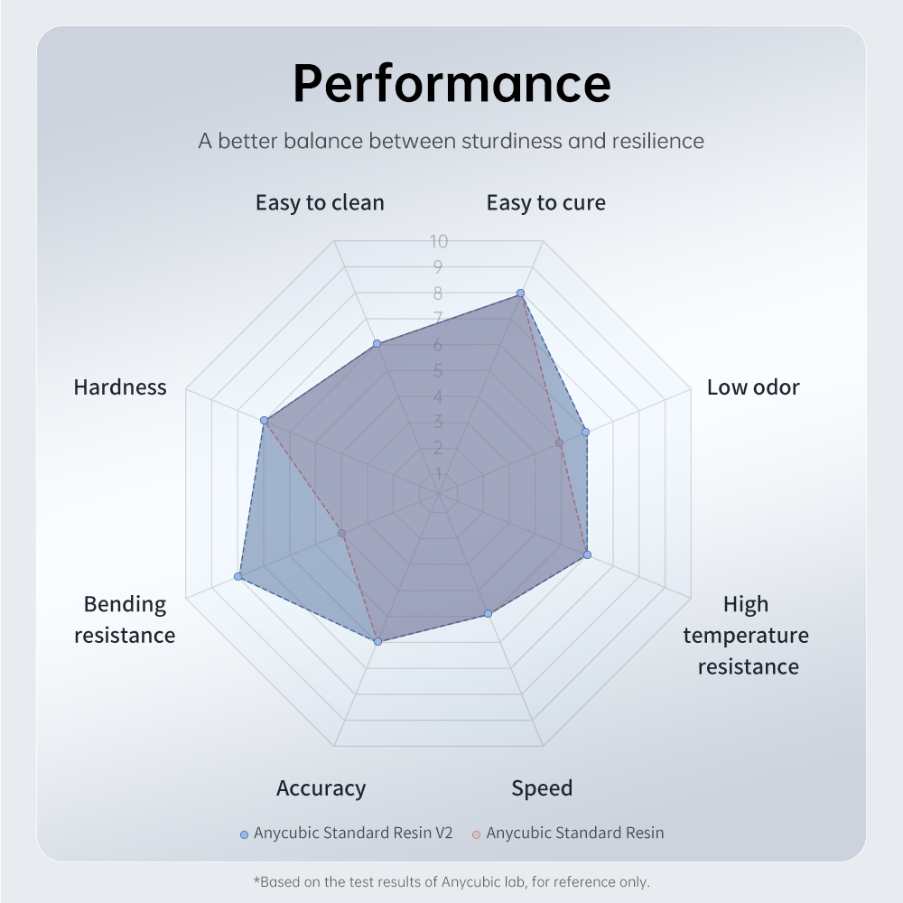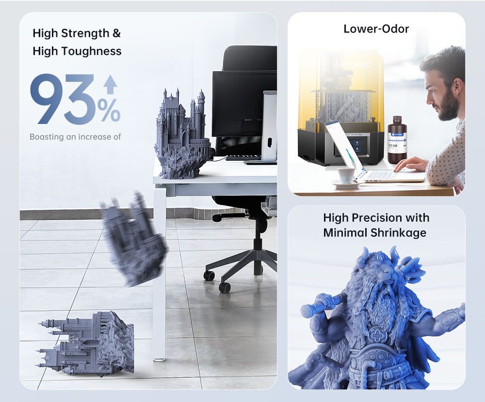 В качестве смолы начального уровня Anycubic Standard Resin V2 с высокой скоростью успешной печати в то же время подходит для печати моделей высокой интенсивности, требующих высокой прочности и ударной вязкости, такие как промышленные детали, сборки, инструменты, архитектурные модели, проверка прототипов, дизайн фигур и т. д.