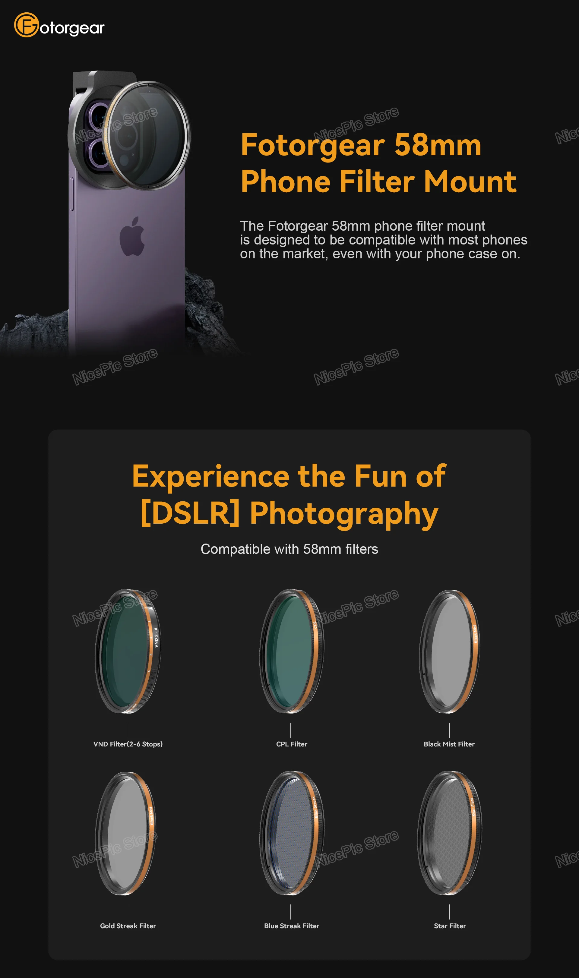 Fotorgear 58 мм универсальный телефонный фильтр для пейзажа/эффектов/Master/CPL/Black Mist/Star Flare/золотистый/синий фильтр для всех смартфонов