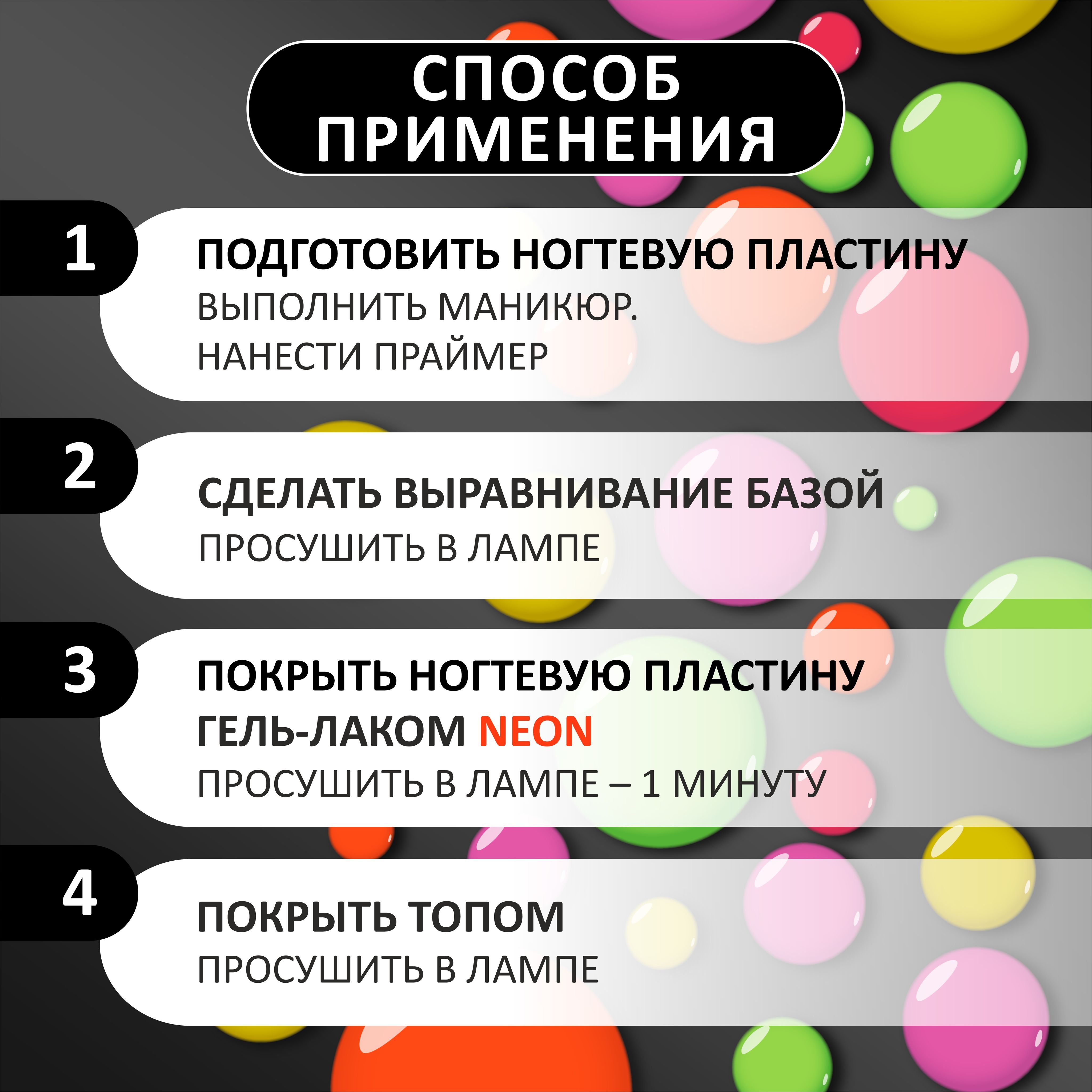 Рекомендуем использовать лампу мощностью не менее 48 Вт. Время полимеризации в УФ-лампе от 2 мин, в LED-лампе 30сек - 1мин.