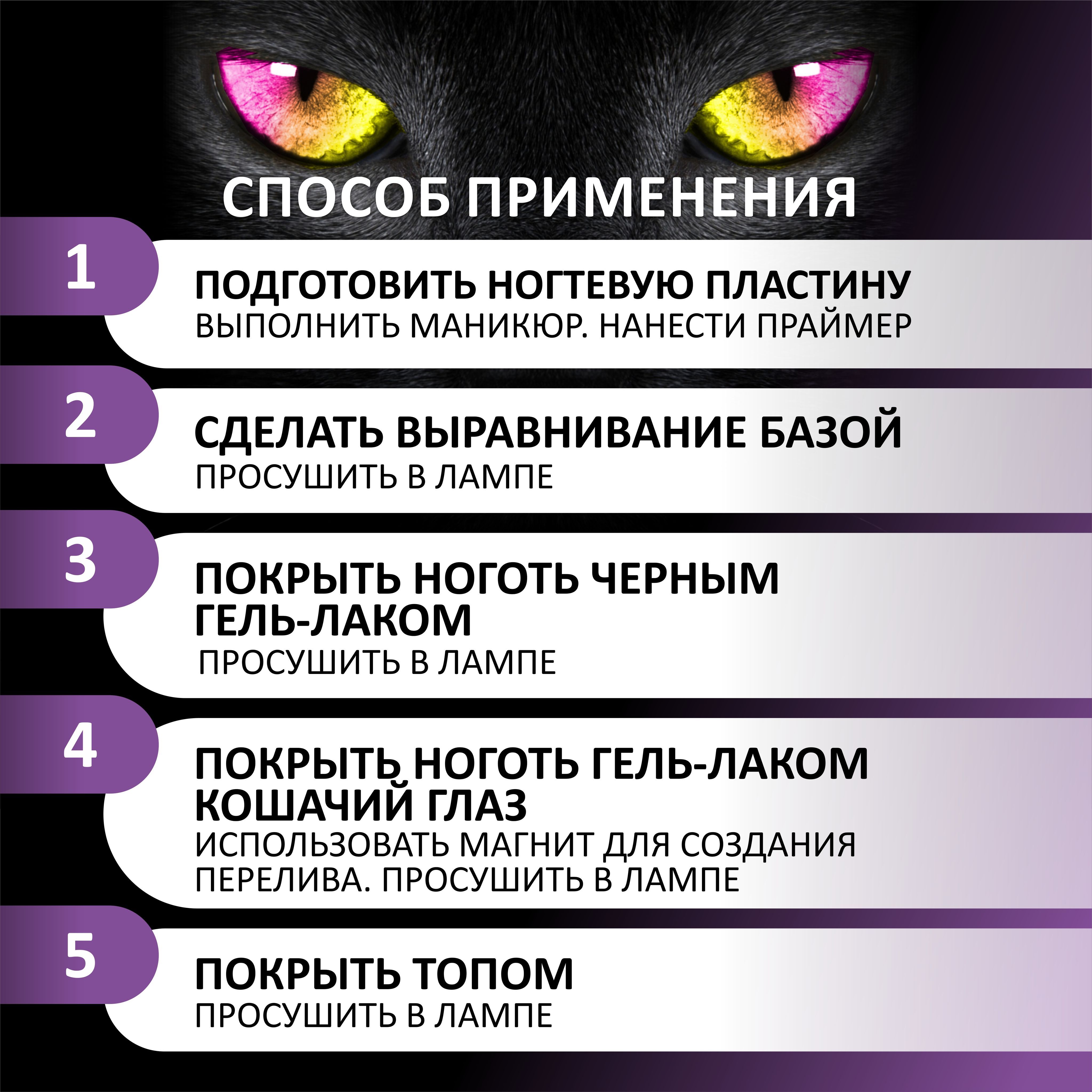 Описание: Foxy expert 9D Cat Eye 8 ml — кошачий глаз Foxy 9D с объемным разноцветным бликом. Такой глубокий галактический узор из блесток напоминает космические тела на фоне ночного, черного неба! Коллекция Foxy Expert кошачий глаз 9D отличается густой консистенцией, металлизированные частички переливаются поликолором и идеально насыщенно смотрятся на черной подложке. Полупрозрачная основа позволяет выбрать в качестве подложки любой цвет, позволяет экспериментировать и дополнять красивым бликом любой маникюр. Для создания еще более выраженного Космоса на ноготках можно дополнить нейл-арт светящимися звездами при помощи тонкой кисти, экспериментировать с формой блика, выбрав фигурные магниты для гель-лака «Кошачий Глаз». Ложатся равномерным слоем, самовыравниваются на ногте.