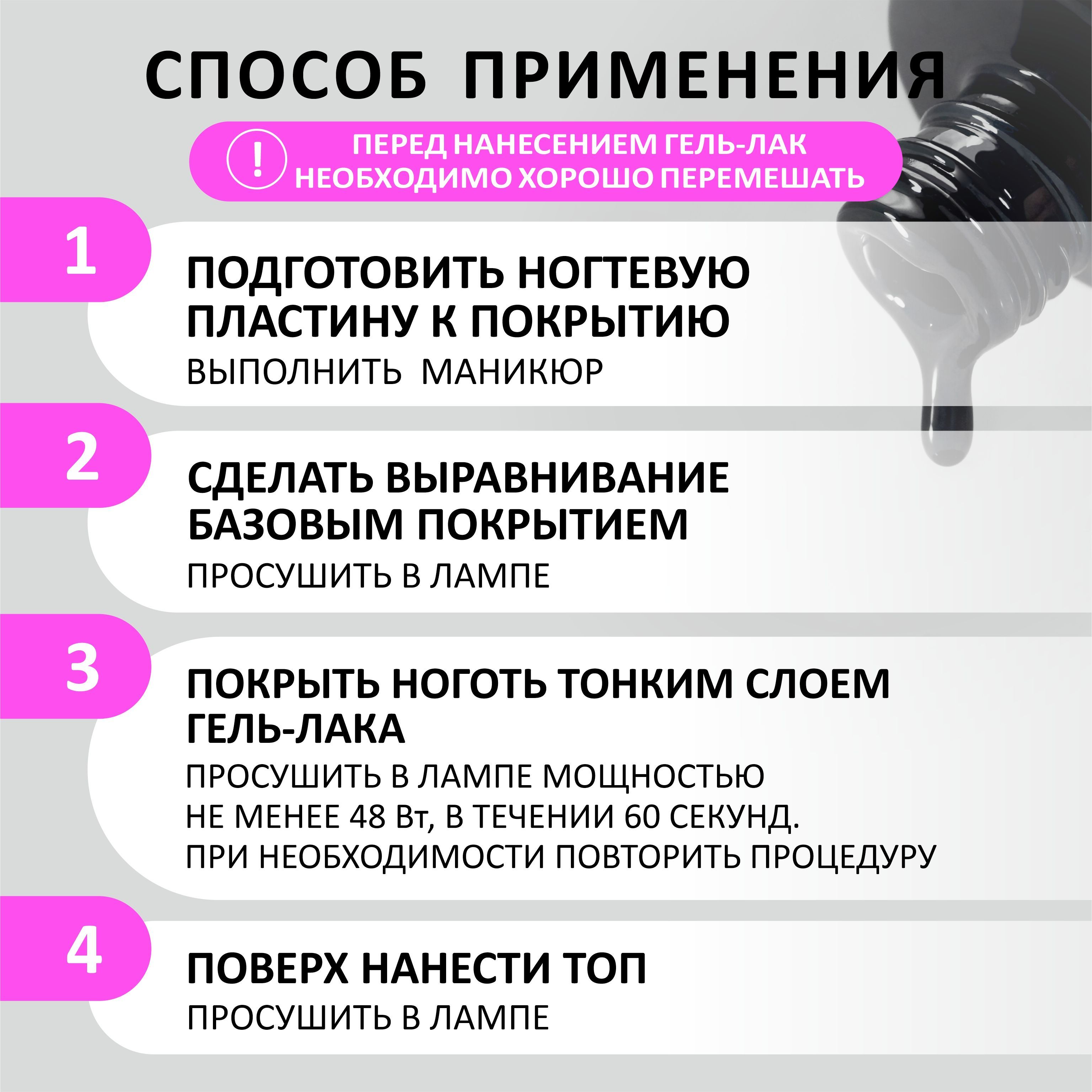 Рекомендуем использовать лампу мощностью не менее 48 Вт. Время сушки в УФ лампе не менее 2х минут, в LED лампе - 1 минута.