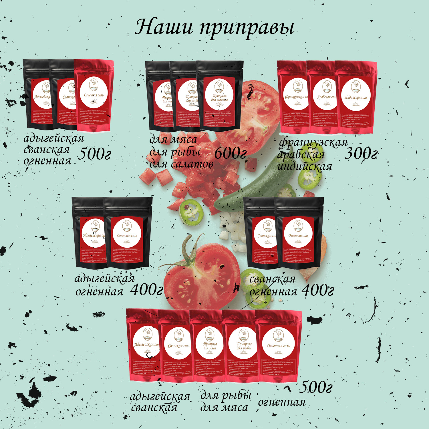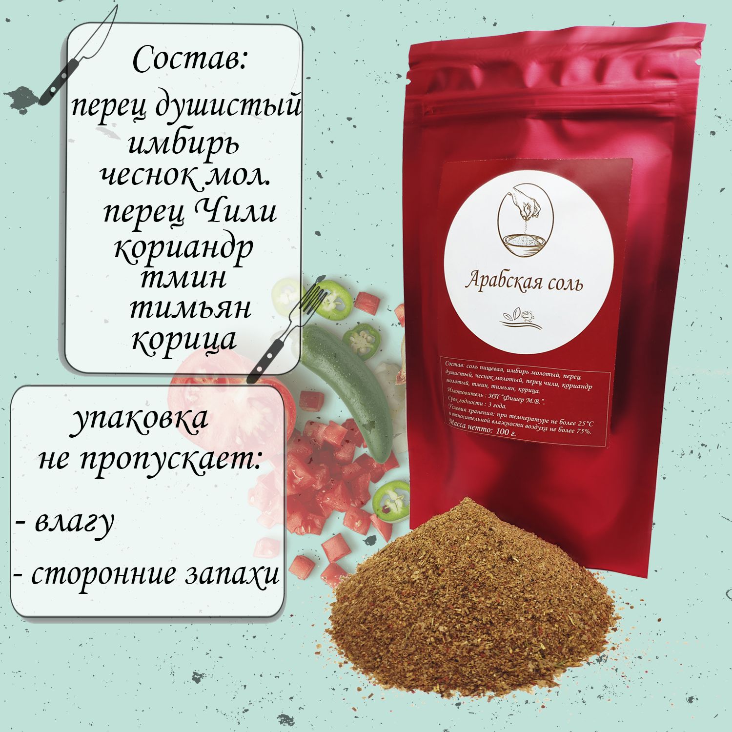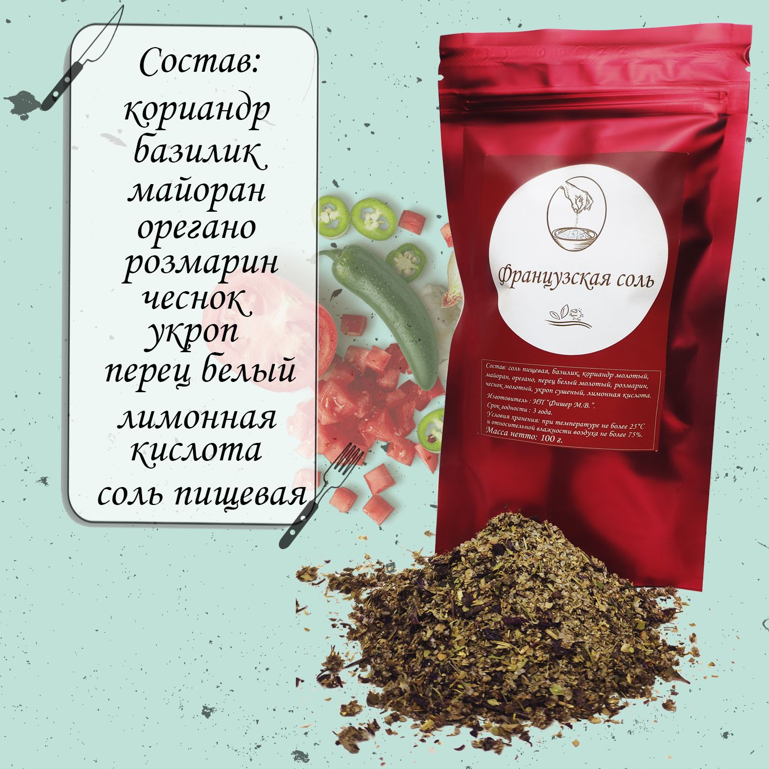 Соль Французская: соль пищевая, базилик суш., кориандр мол., лимонная кислота, майоран суш., орегано суш., перец белый мол., розмарин суш., чеснок мол., укроп суш.. Соль Арабская: соль пищевая, имбирь мол., перец душистый мол., чеснок мол., перец Чили мол., кориандр мол., тмин мол., тимьян суш., корица мол.. Индийская соль: соль пищевая, кардамон мол., карри, куркума, перец белый мол., перец Чили мол., тмин мол..