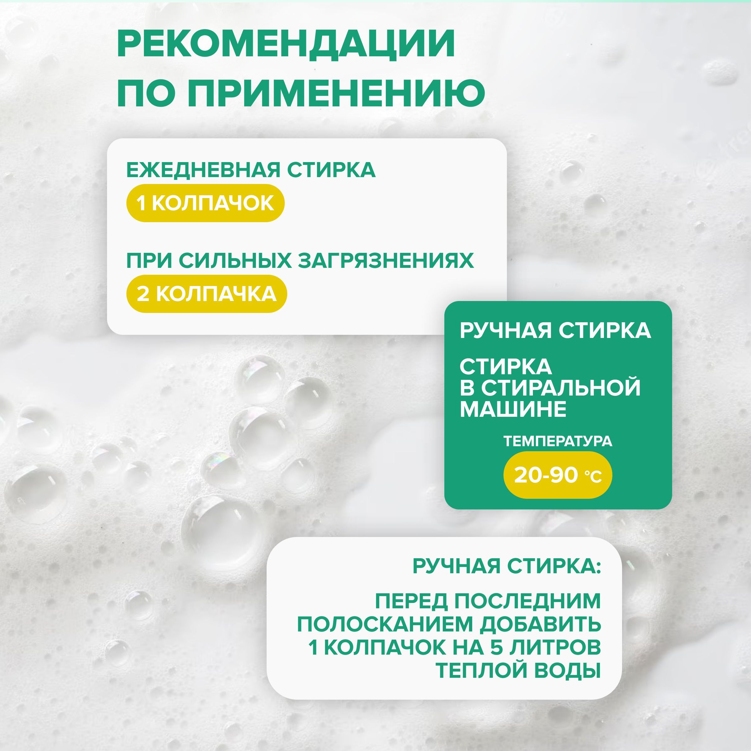 Кондиционер полностью вымывается из белья, попадая в сточные воды, не загрязняет окружающую среду.