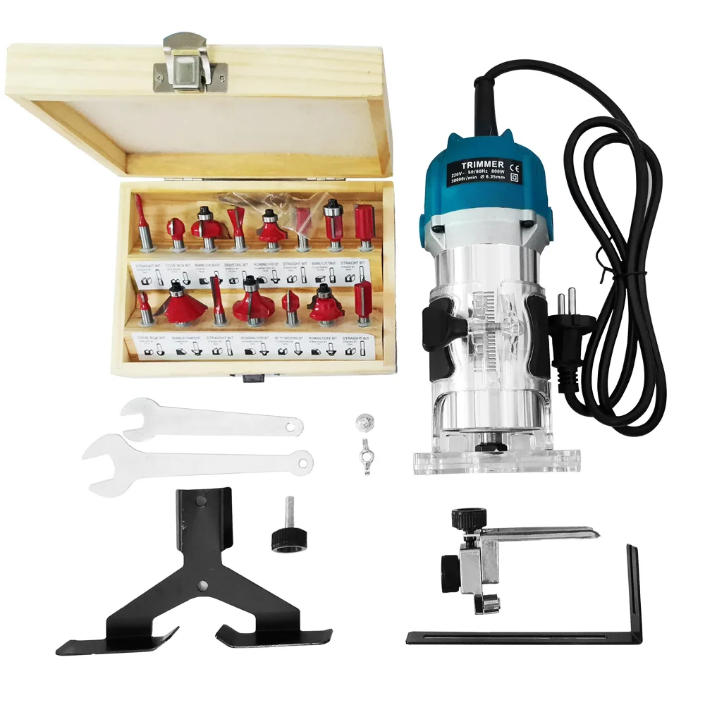 Станок и резак: 1 основной станок, 2 гаечных ключа, 1 направляющий узел триммера, 1 прямой направляющий узел, 1 Монтажная ручка, 1 винт, 15 фрез
