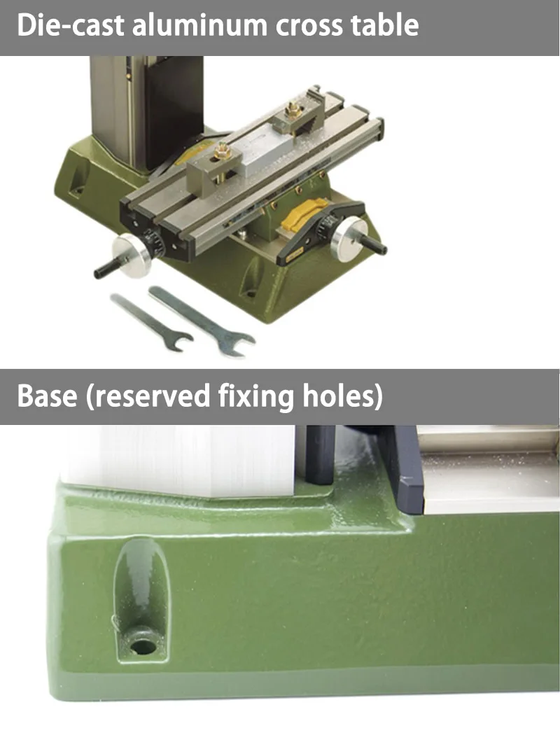 Основание серого чугуна. Включая как вертикальную колонку, так и составную таблицу обработанного, качественного алюминия. Все оси бесplay-free и имеют регулируемые гибы. Изголовье литого алюминия содержит 24 полюсный Специальный (Сбалансированный) Мотор супер стабильный даже на высоких рабочих скоростях. Эта стабильность облегчает использование лучших резцов. Тройная щель, закаленная стальная крышка MICROMOT collets 1,0-1,5-2,0-2,35-3,0-3,2 мм. Таблица оснащена 3 Т-образными слотами для микромота 12x6x5 мм. Регулируемая шкала линейки облегчает позиционирование заготовки. Все маховики нулевые регулируется с помощью 1 оборот = 1,0 мм, 1 деление = 0,05 мм.