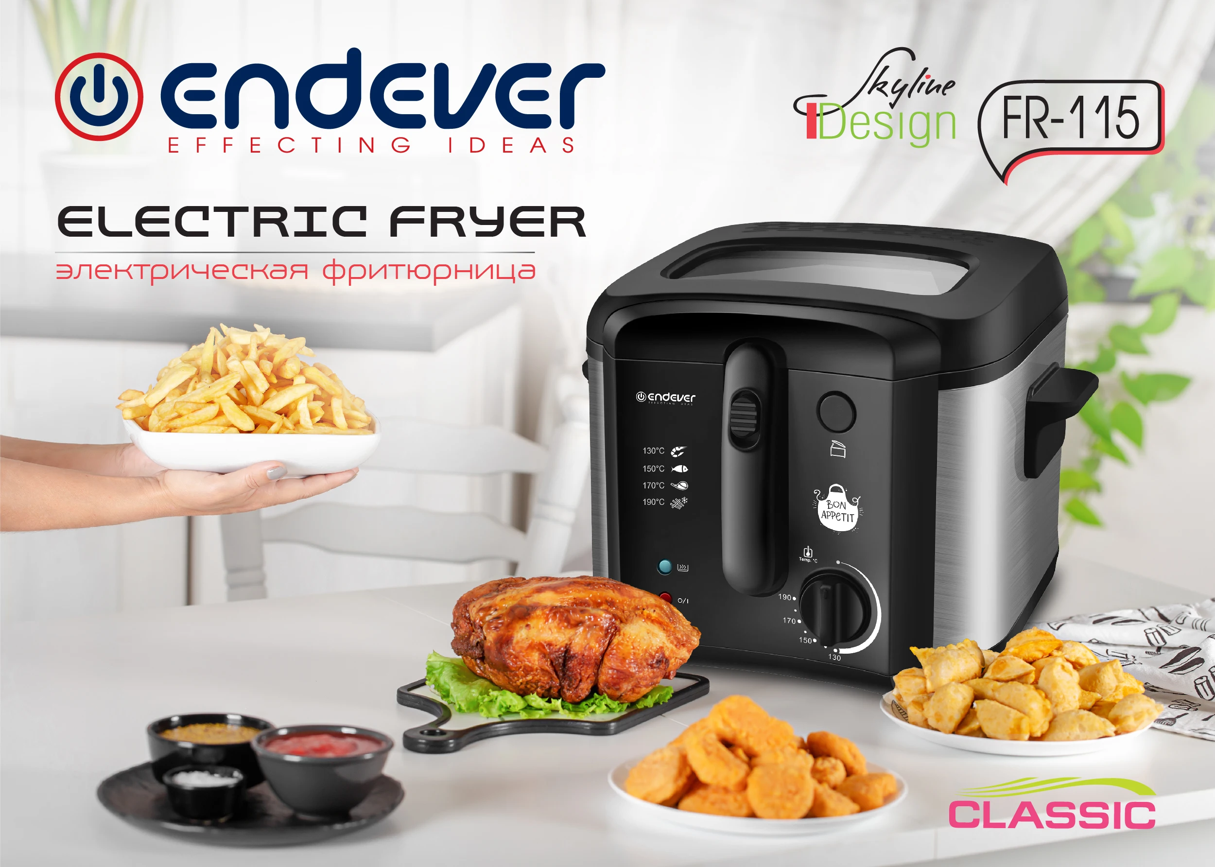 Удобная в использовании, компактная электрическая фритюрница ENDEVER Skyline FR-115 является очень полезным устройством на кухне каждой хозяйки. Она позволит с легкостью приготовить не только картофель фри, но и другие вкусные и разнообразные блюда для всей семьи, такие как вкусные домашние чипсы, пончики, донатсы, пахлаву, хворост, чебуреки, наггетсы, пирожки, сырные шарики и т.д. Благодаря воздействию высокой температуры со всех сторон одновременно, продукты готовятся быстрее, чем на сковороде, и равномерно покрываются аппетитной хрустящей корочкой, под которой почти нет масла.