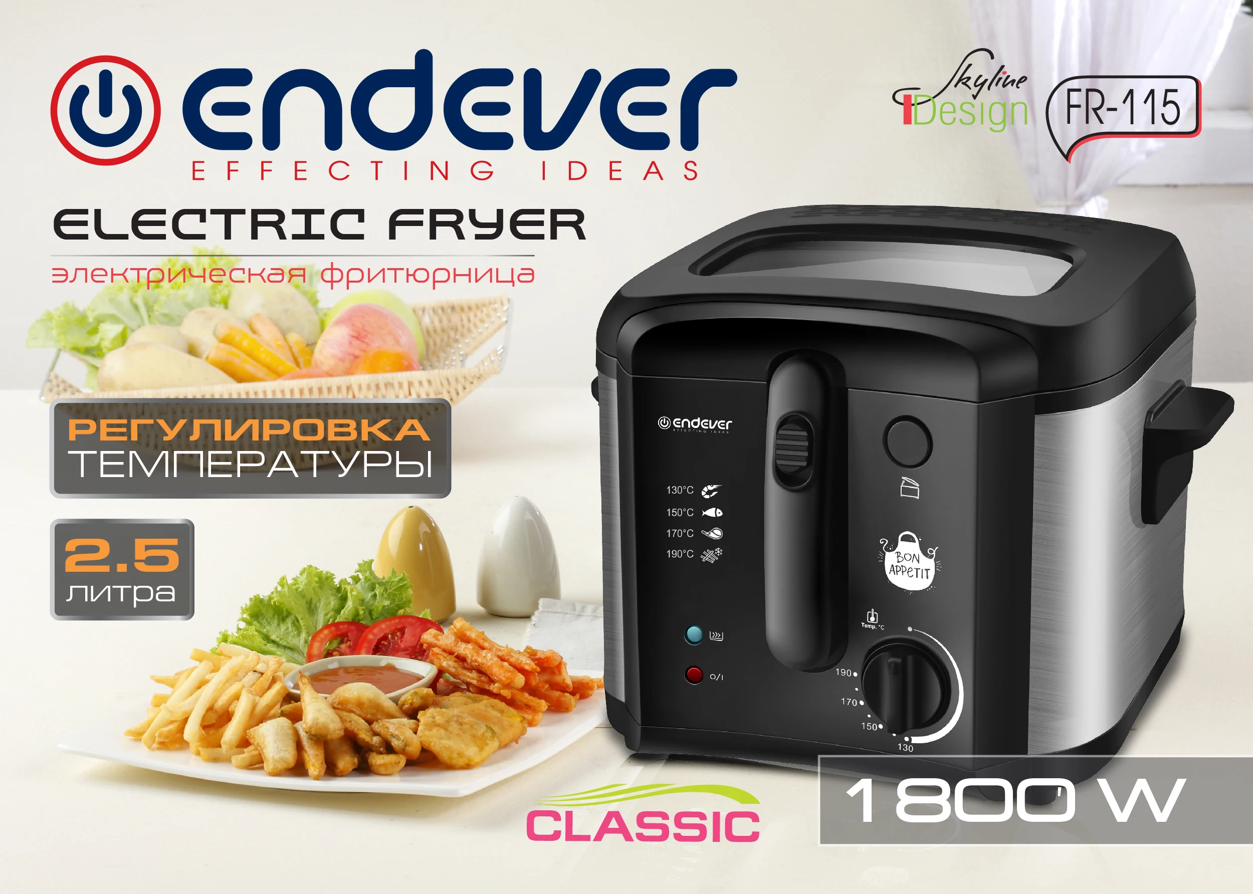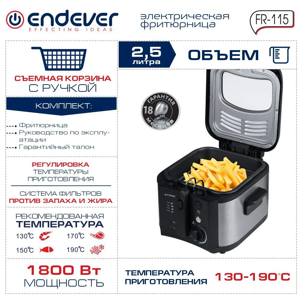 Фритюрница электрическая ENDEVER Skyline FR-115, 1800 Вт, Регулировка температуры приготовления, Съемная крышка