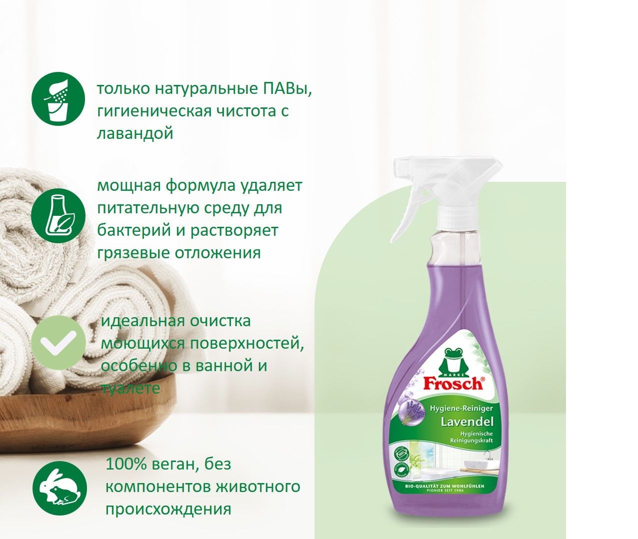 Описание: Антибактериальное средство обеспечивает естественную и гигиеничную очистку поверхностей, особенно в ванной и туалете. Благодаря высокоэффективной формуле с экстрактом лаванды средство удаляет питательную среду бактерий и  растворяет отложения грязи, остатки мыла, пятна от воды и известковый налет. Идеально подходит для  очистки душевых и ванных комнат, различных пластиковых и акриловых поверхностей. Устраняет неприятные запахи в доме и оставляет после себя благоухающий аромат лаванды.
