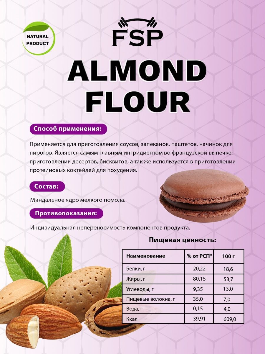 Описание: Миндальная мука FSP есть не что иное, как перемолотый в мелкий порошок миндальный орех, один из самых вкусных представителей орехового братства. Лечебные свойства миндальной муки обусловлены её химическим составом, в котором содержатся: насыщенные жирные кислоты, холин, бета-каротин, витамины В1, В2, В5, В6, В9, А, С, Е и РР, а также калий, кальций, магний, цинк, селен, медь и марганец, железо, хлор и сера, йод, хром, фосфор и натрий. Миндальная мука не только вкусна, но и чрезвычайно полезна, её рекомендуется употреблять при нарушении зрения, бессоннице, малокровии и судорогах. Мука миндальная мелкого помола без глютена идеальна для выпечки, десертов (макаронс, марципана, бисквитов, печенья) и для загущения соусов и крем-супов. Мука из миндаля это и правильное питание, спортивное питание для похудения и незаменимый компонент для того, чтобы приготовить кондитерский крем, протеиновый коктейль, коктейль для похудения и спорт питание. Веганский продукт, отлично подходит для кето диеты, без консервантов, без добавок, без ГМО.