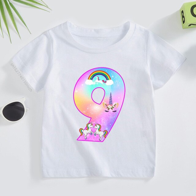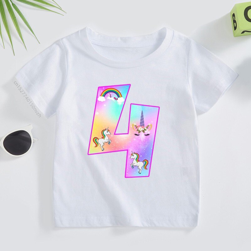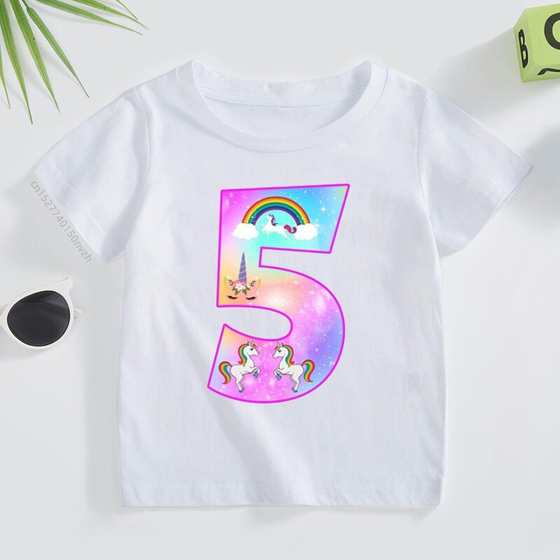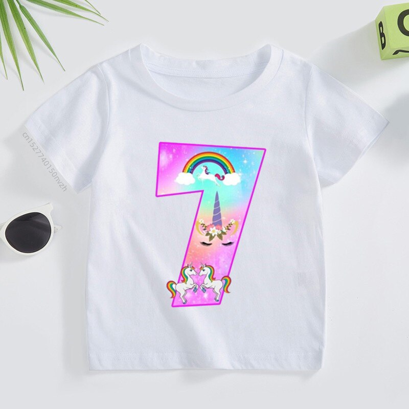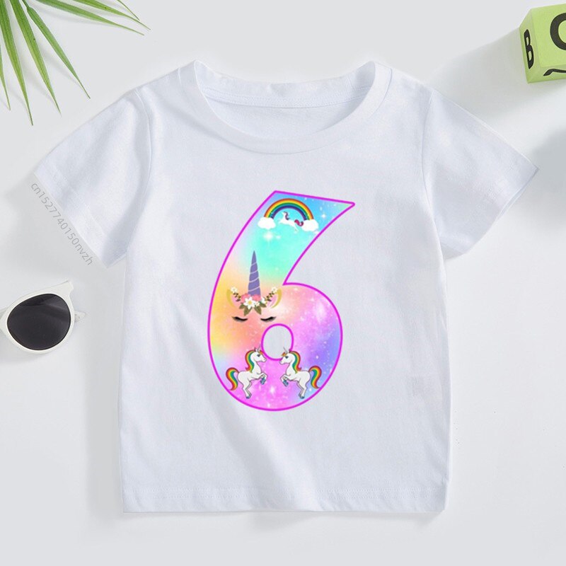 Футболка детская с принтом «Единорог», милая Радужная рубашка с цифрами 2-9, летний топ для маленьких девочек, Повседневная белая футболка для подростков, подарок на день рождения