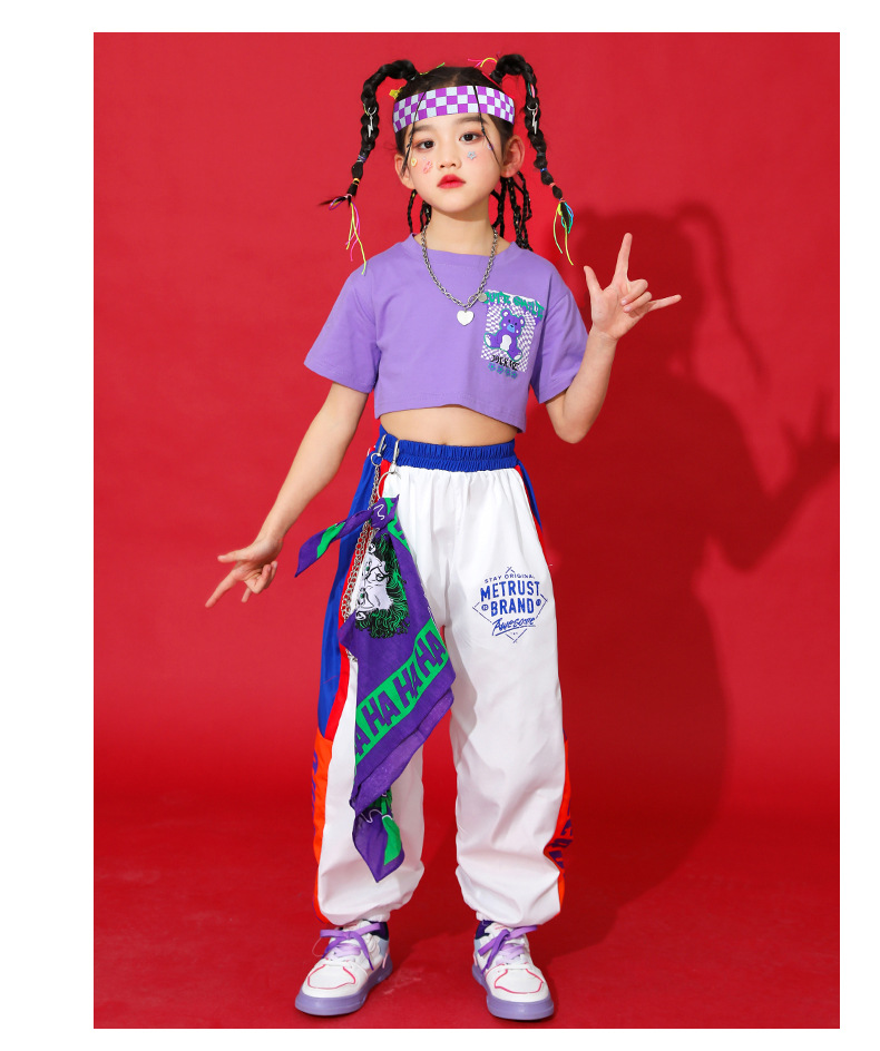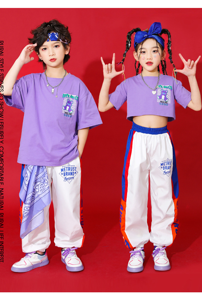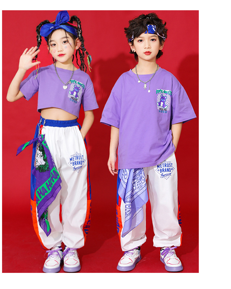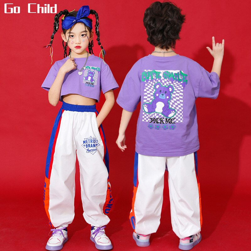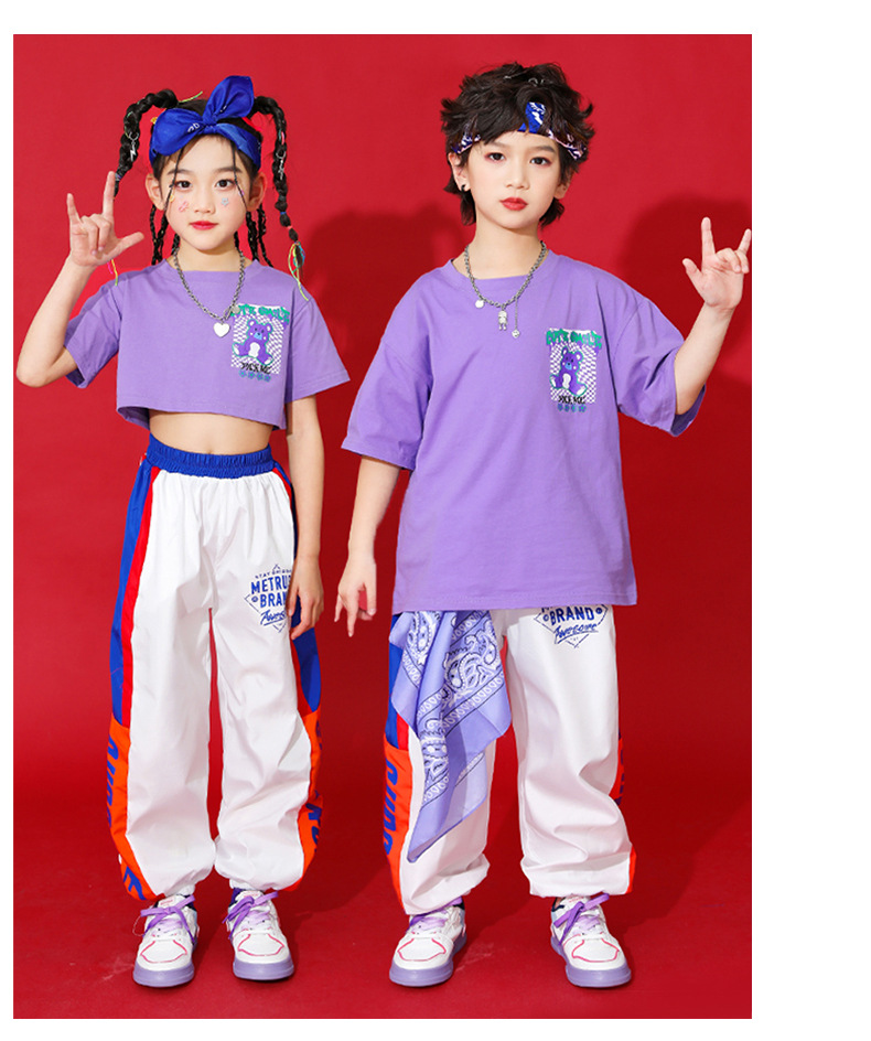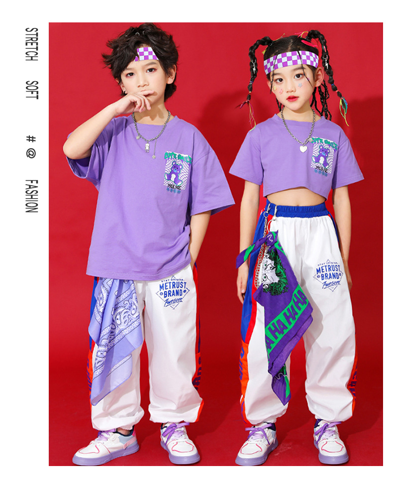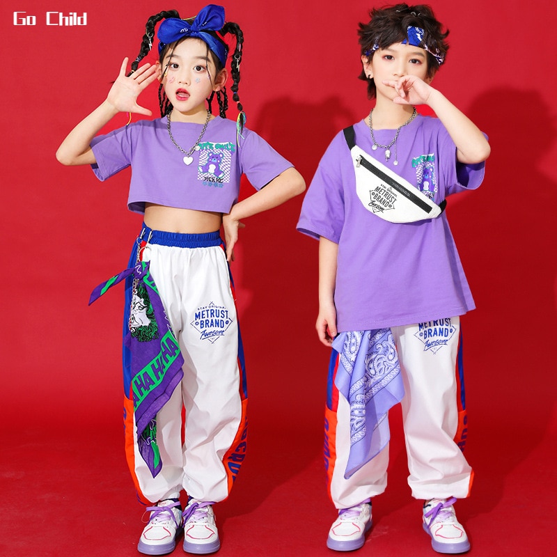 Футболка для мальчиков в стиле хип-хоп, фиолетовые спортивные штаны для уличных танцев, кроп-топ для девочек, джоггеры, Детская уличная одежда, комплект одежды для детей, костюм для джазовой сцены