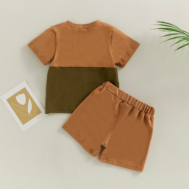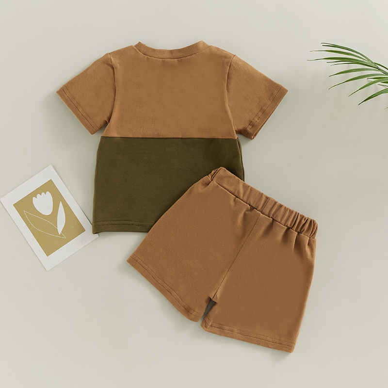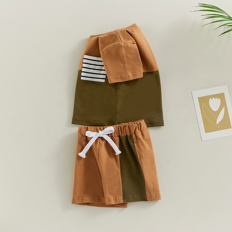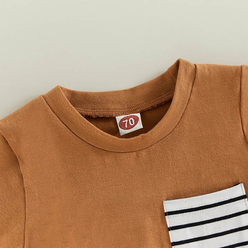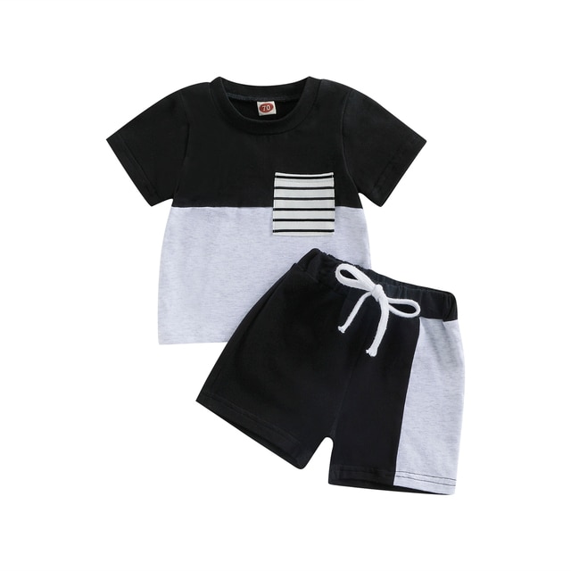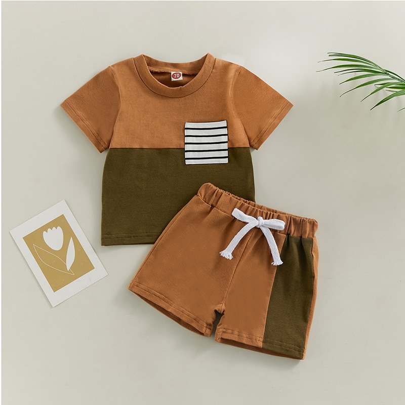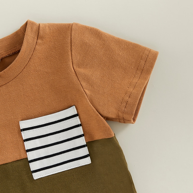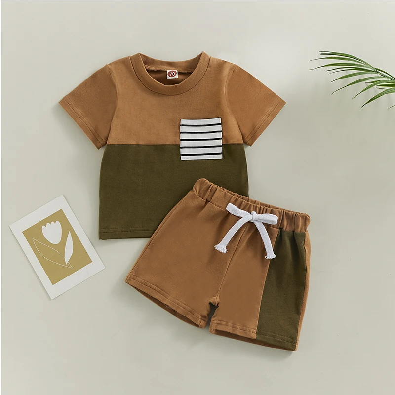 Контрастный цвет, круглый вырез, декоративный нагрудный карман в полоску, летняя футболка-пуловер с короткими рукавами для мальчика и шорты с эластичной талией, которые делают вашего маленького мальчика более привлекательным среди сверстников.