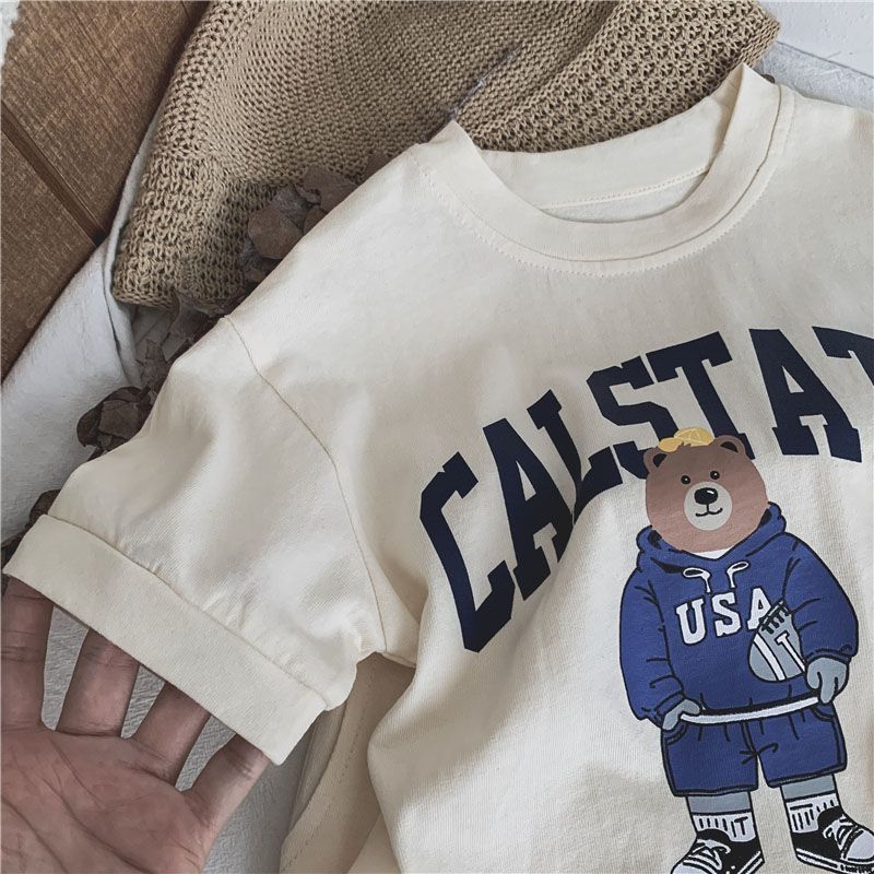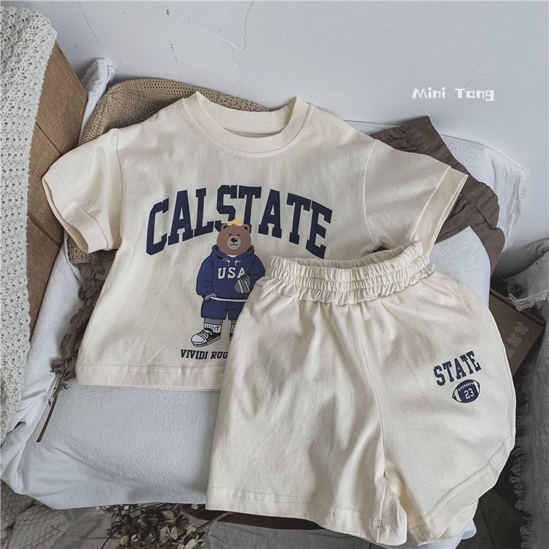 Футболка с коротким рукавом для мальчиков и девочек, милый однотонный тонкий спортивный костюм из двух предметов, штаны с героями мультфильмов, на лето