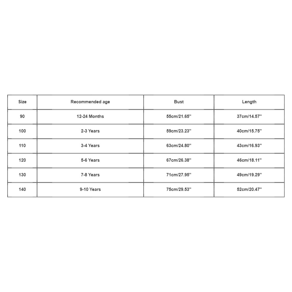 Размер: 140 Рекомендуемый возраст: От 9 до 10 лет Бюст: 75 см/29,53 дюйма Длина: 52 см/20,47 дюйма